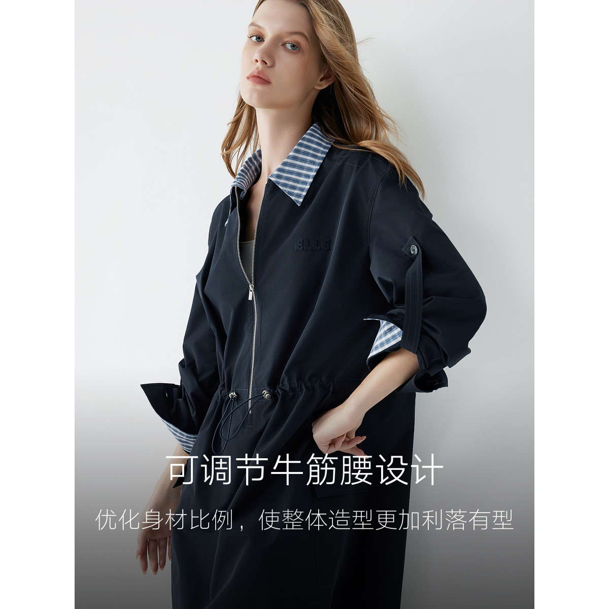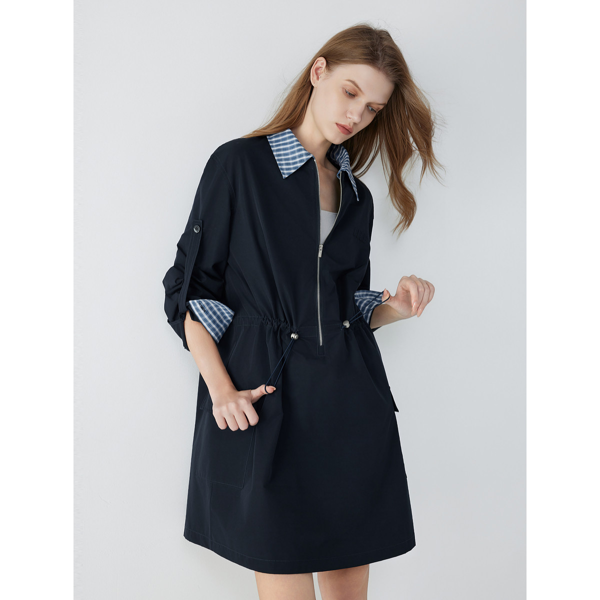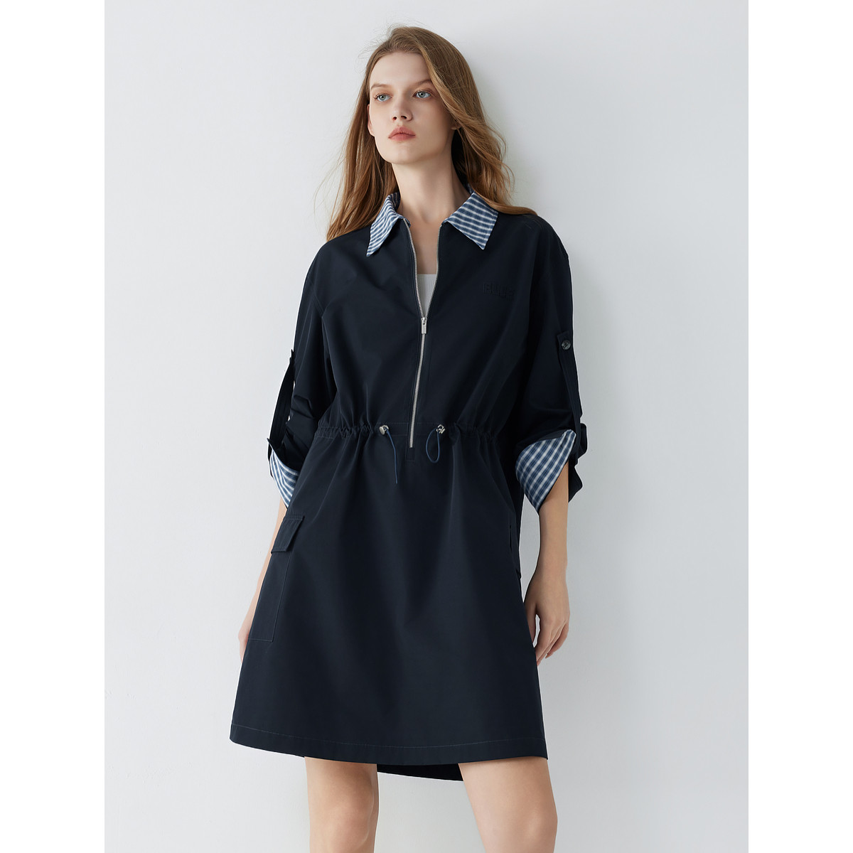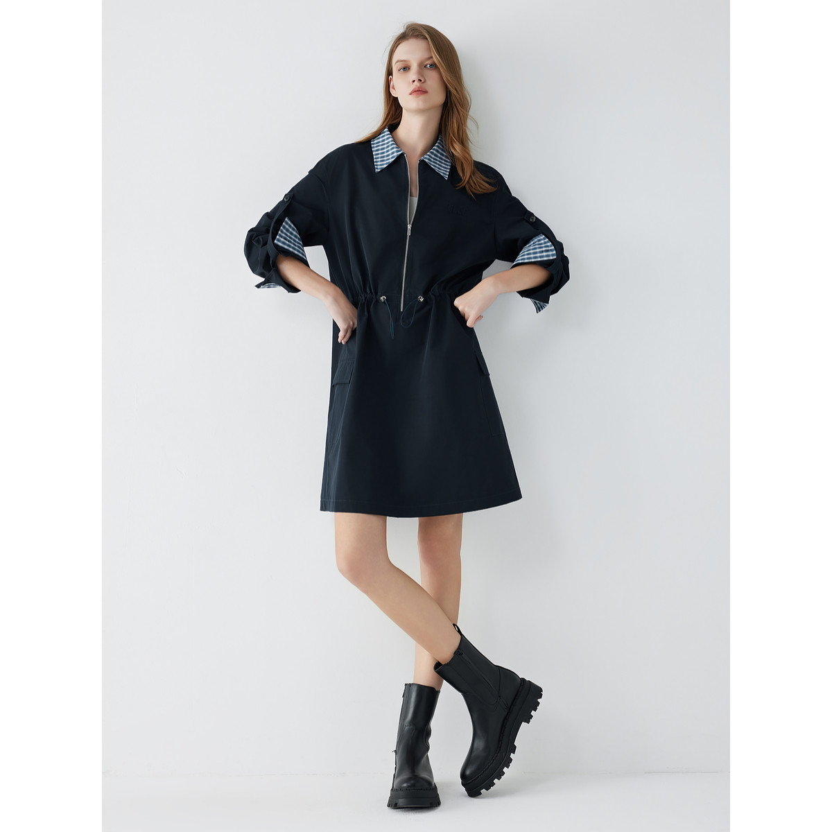 ELLE格纹假两件长袖连衣裙女2025秋季新款拼接收腰气质通勤风短裙