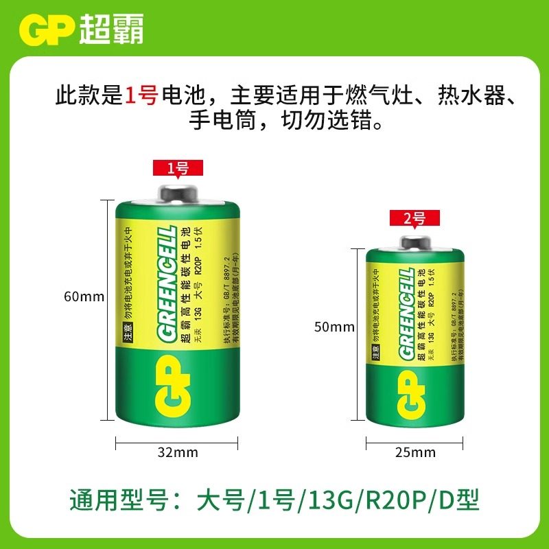 GP超霸2号电池万用表座钟C型中号R14二号电池3号1.5v碳性家用通用