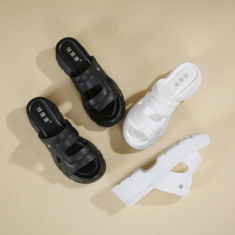 坡跟真皮凉拖鞋女2025欧美风夏季外穿时尚松糕厚底休闲一字拖凉鞋