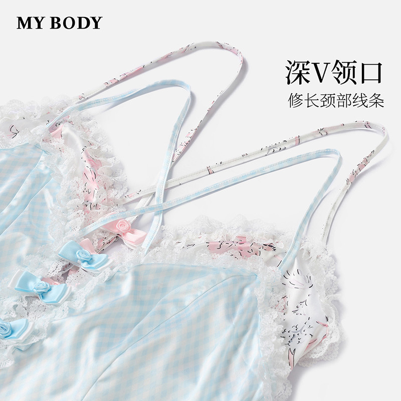 商场同款MYBODY新款优雅蕾丝蝴蝶结深V丝滑性感可外穿吊带睡裙女