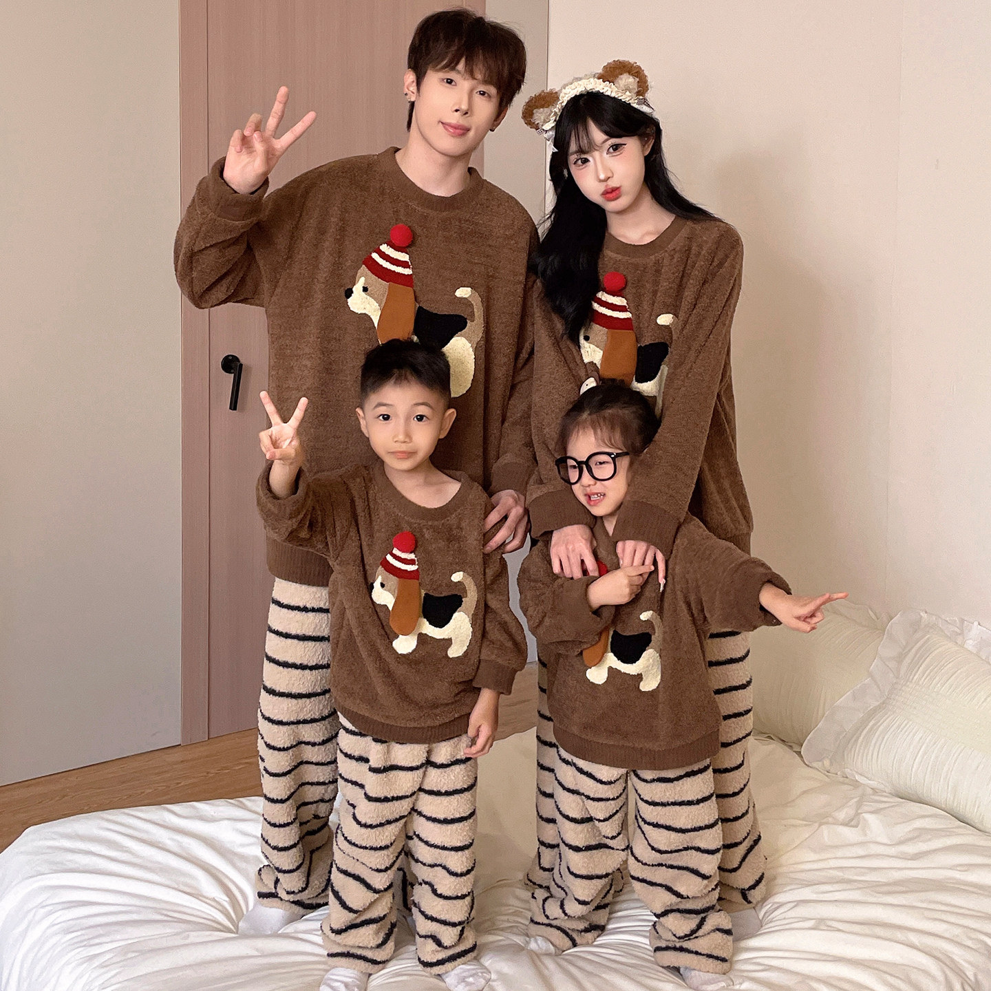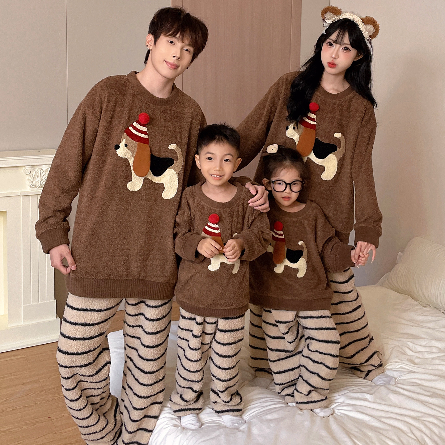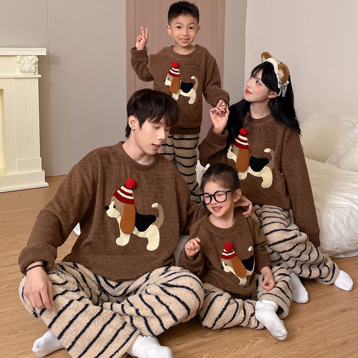 亲子装半边绒睡衣一家三口四秋冬季女生腊肠狗家居服情侣休闲套装