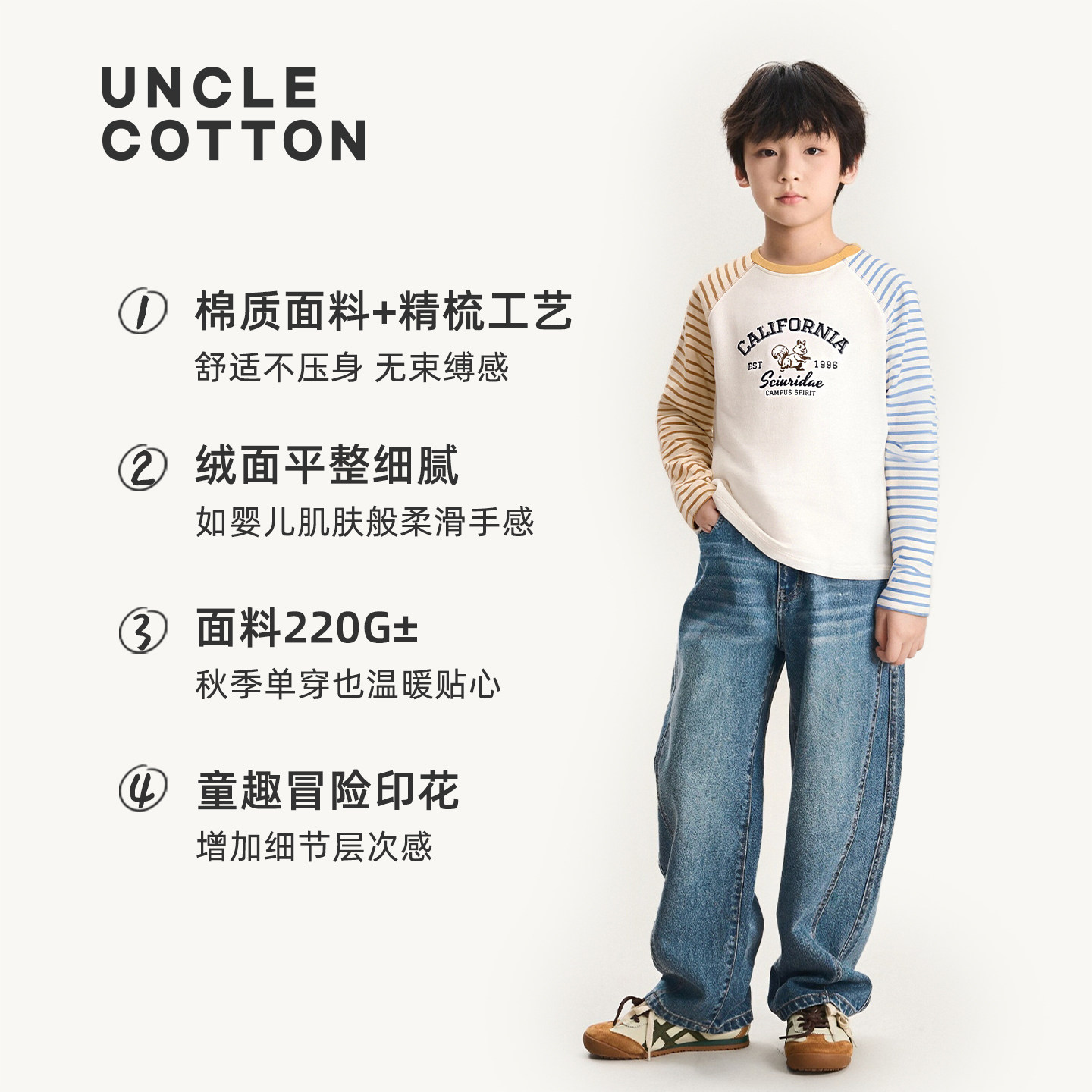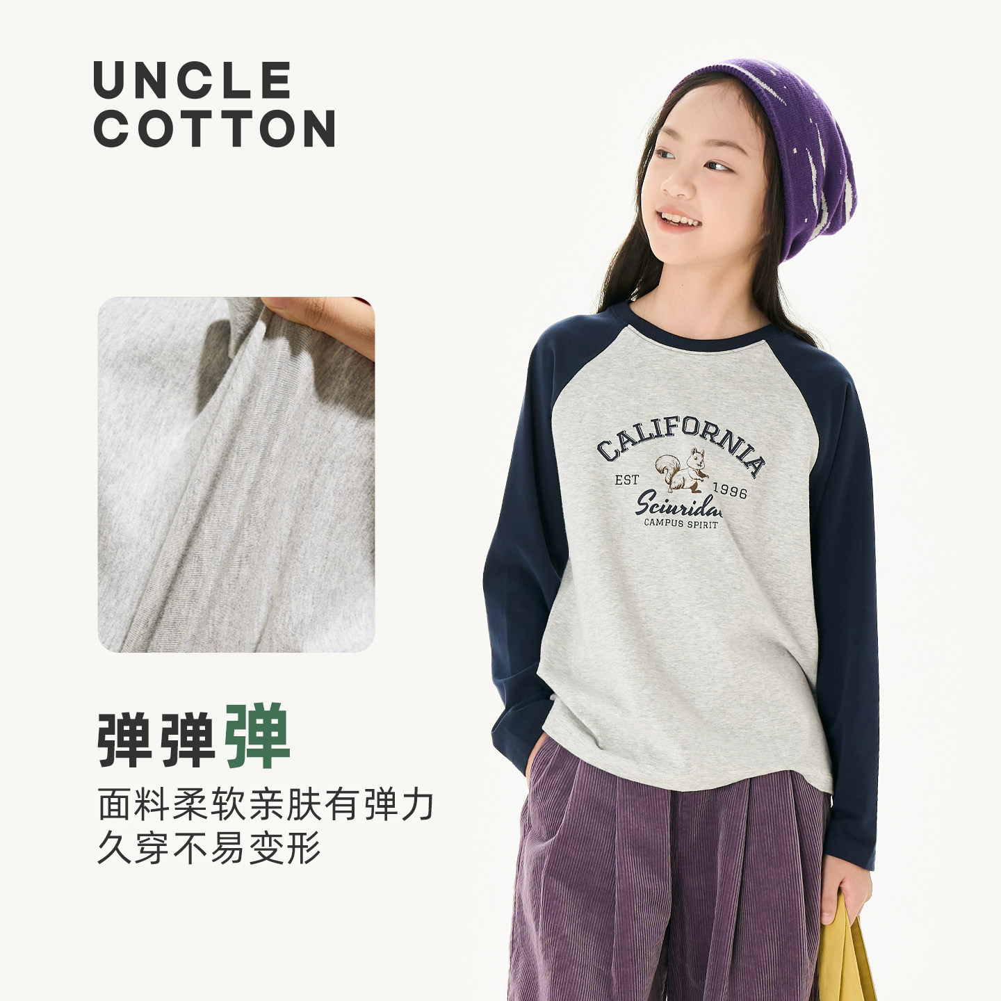 【舒适棉族】棉叔叔女童学院风条纹插肩袖T男童秋新品宽松长袖T恤