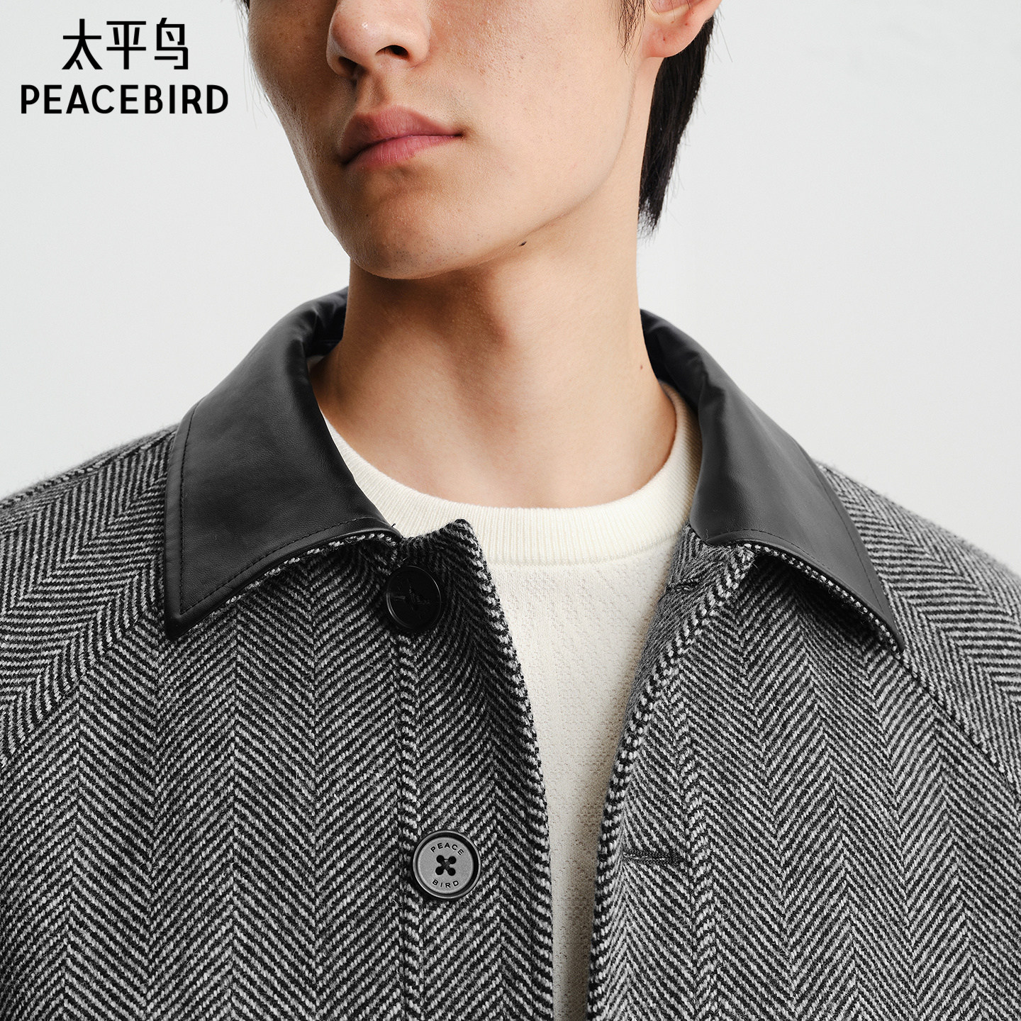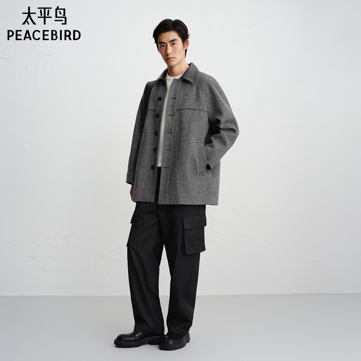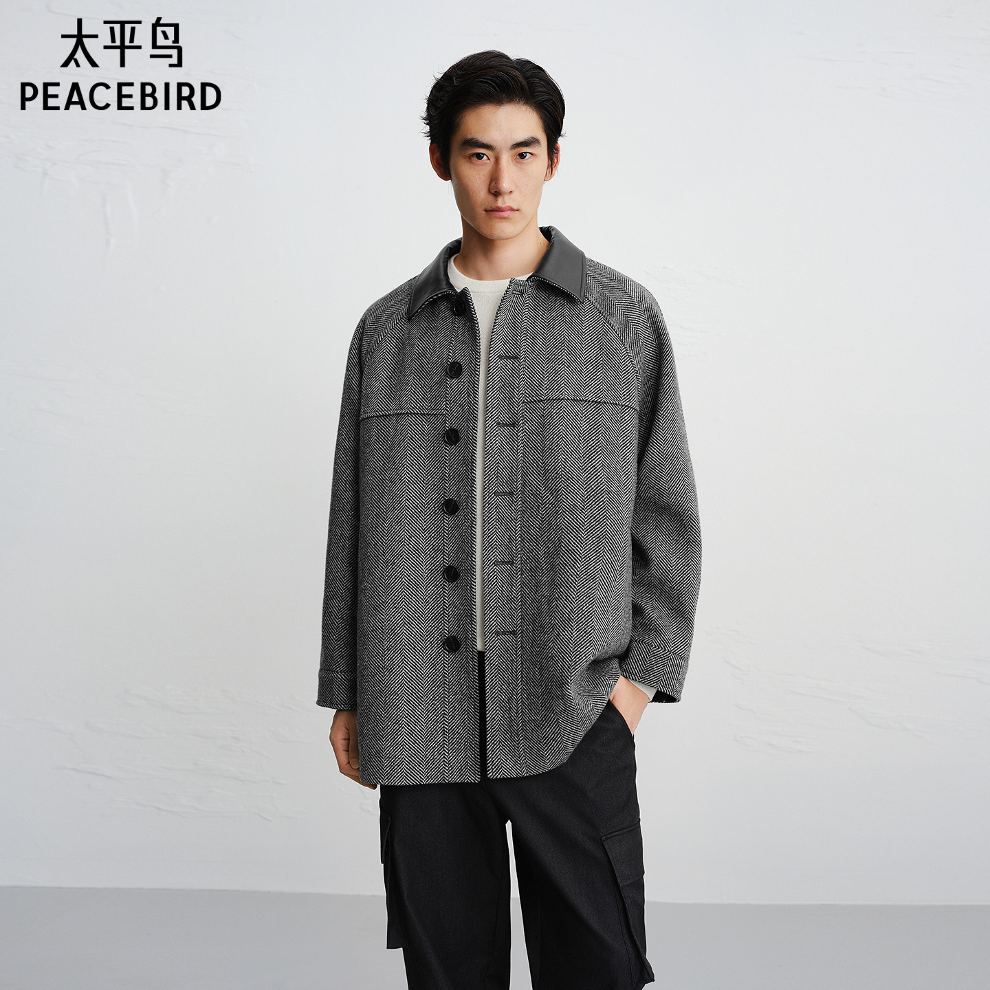 【商场同款】太平鸟男装潮流PU皮领子拼接宽松毛呢大衣B1AAF440F@