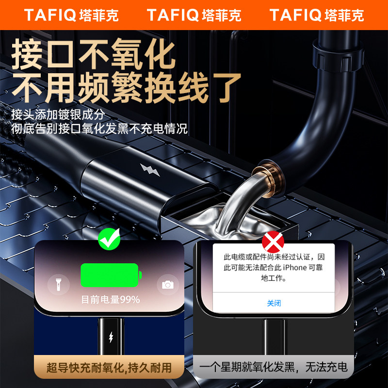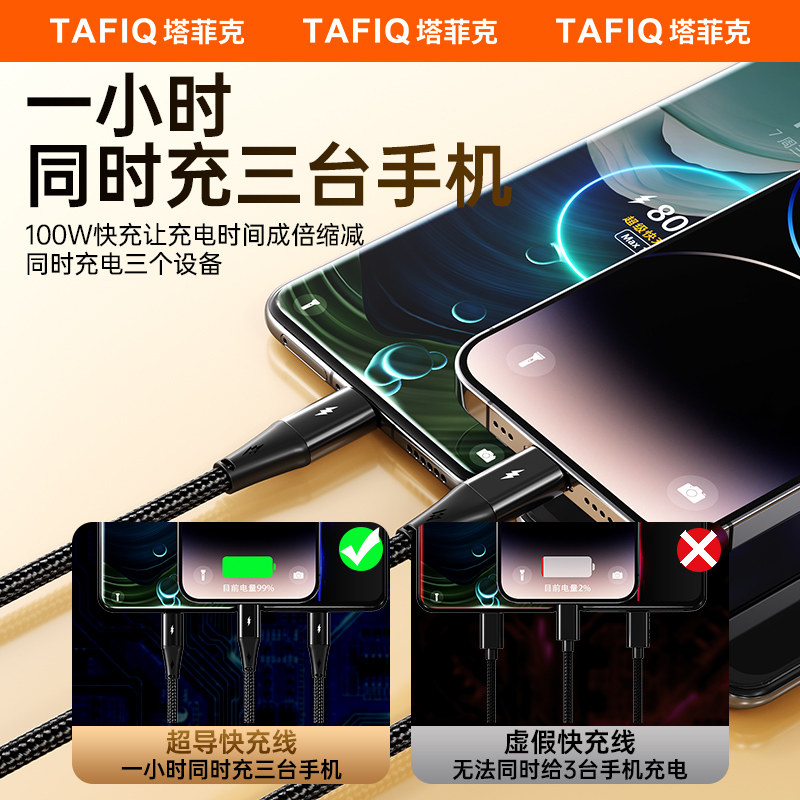 塔菲克100W超级快充数据线三合一拖三充电器宝车载万能通用手机usb多头二多功能适用安卓iPhone苹果tpyec华为