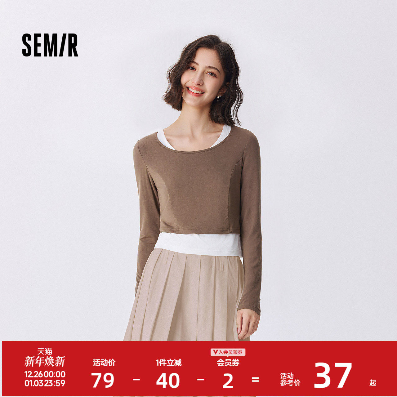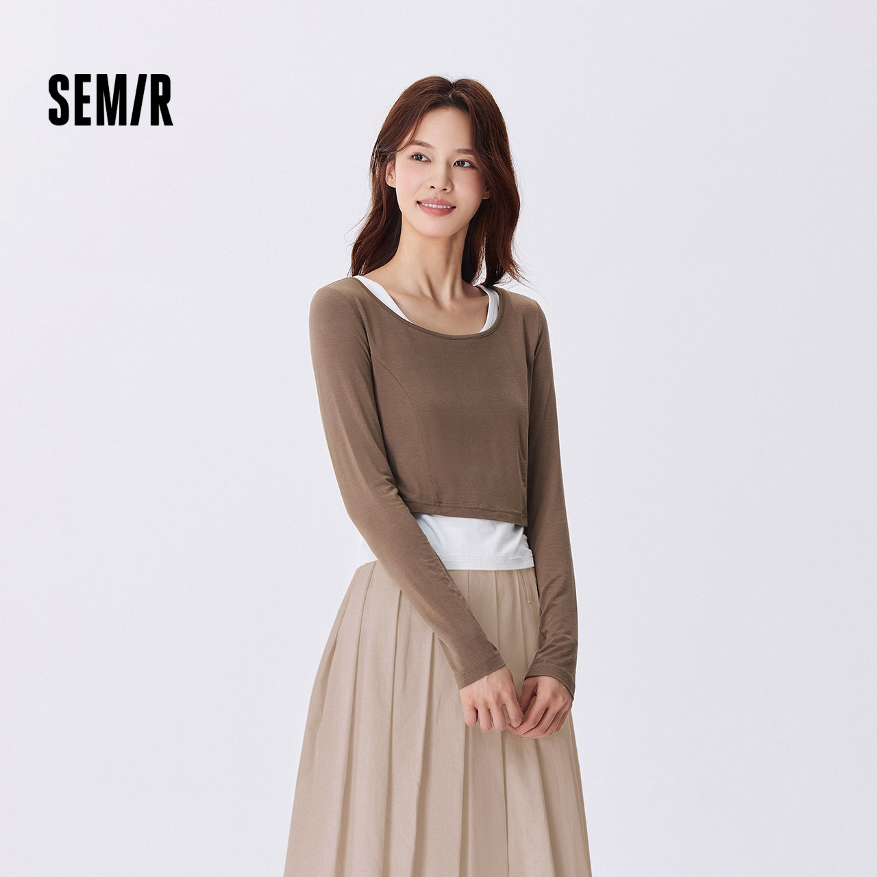 森马长袖T恤女短款上衣显瘦纯色背心秋季新款紧身两件套气质