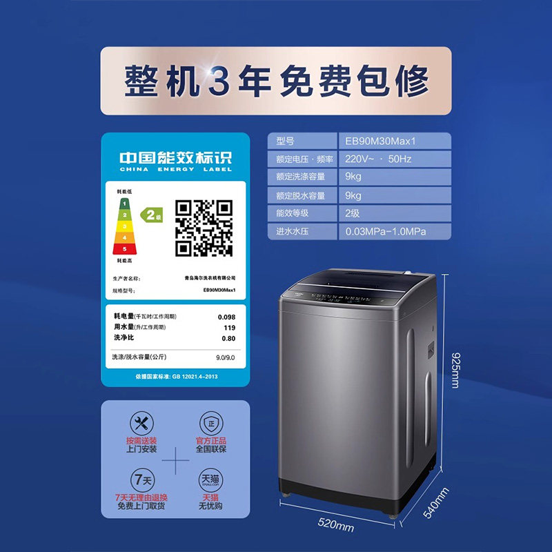 海尔波轮洗衣机9公斤家用全自动大容量洗脱一体除螨小型租房Max1