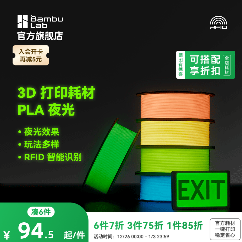 拓竹PLA 夜光 3D打印耗材 透亮高韧性 环保易打印 RFID智能参数识别