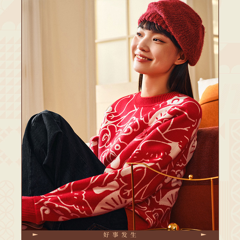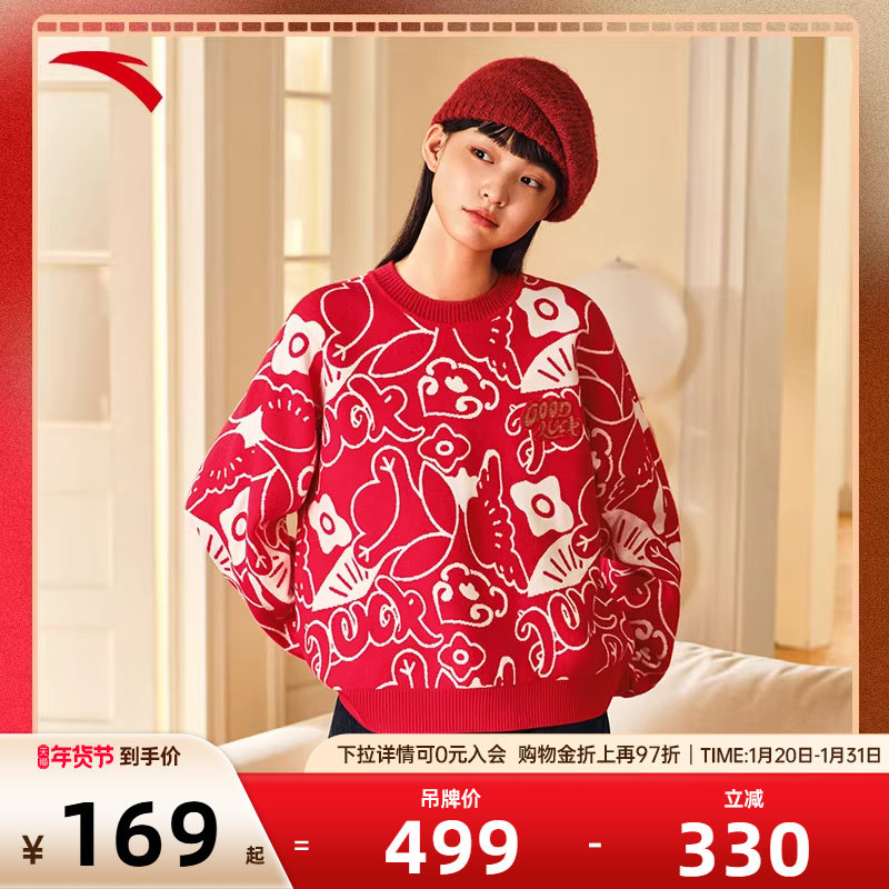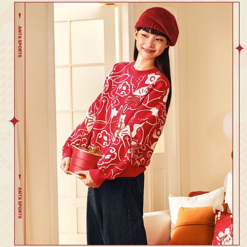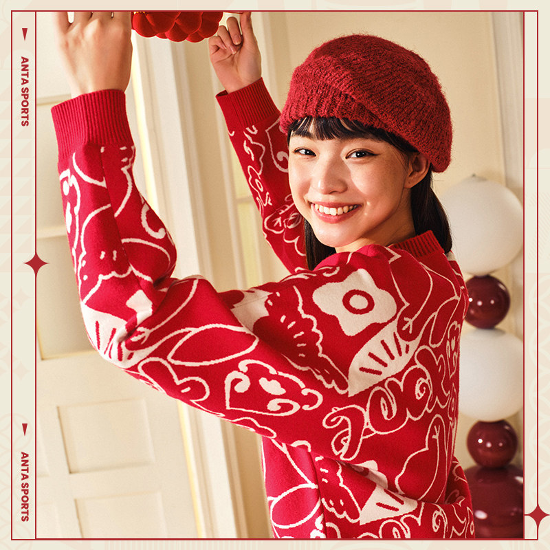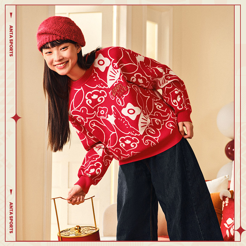 安踏好事发生丨新年红色毛衣女款宽松百搭卫衣针织上衣马年本命年