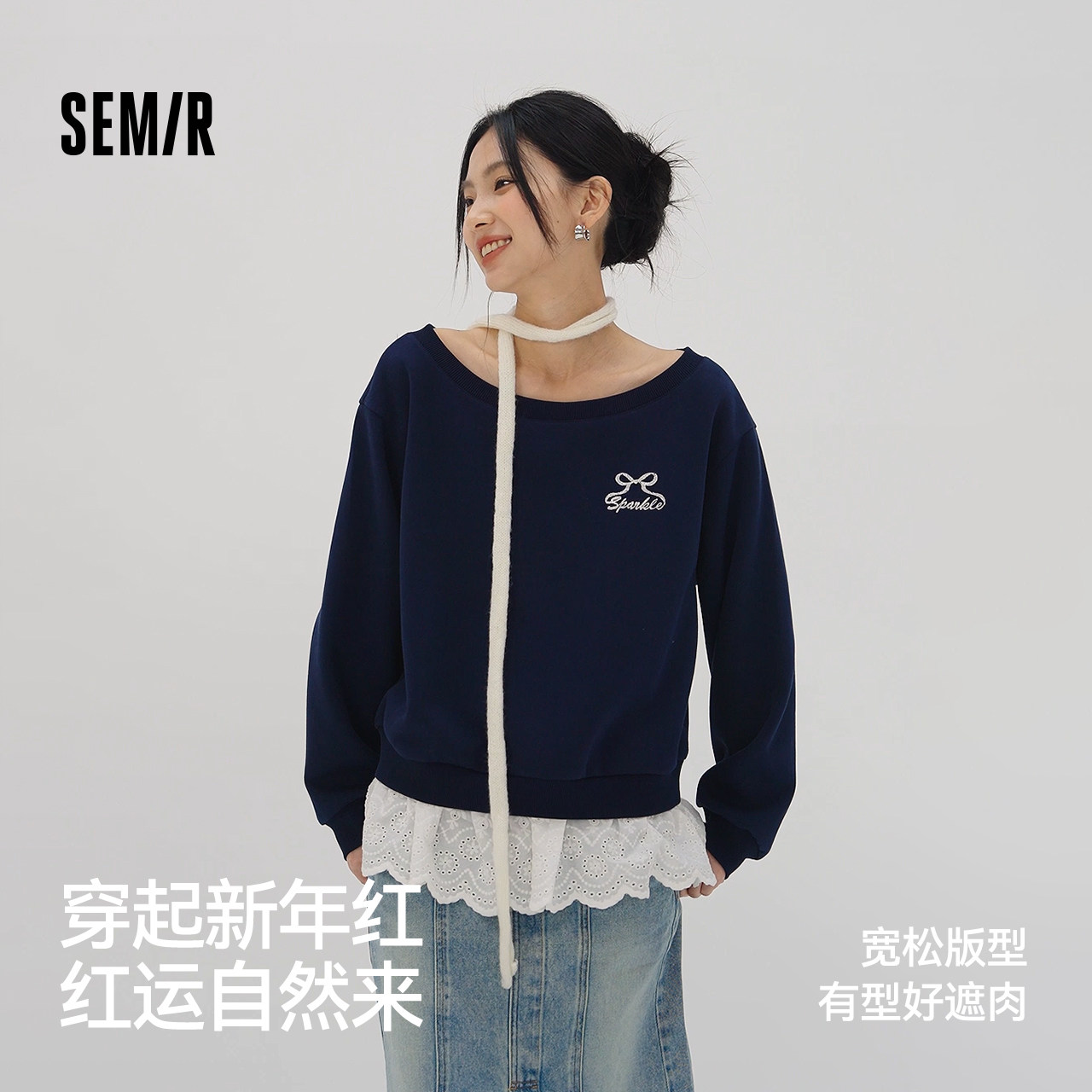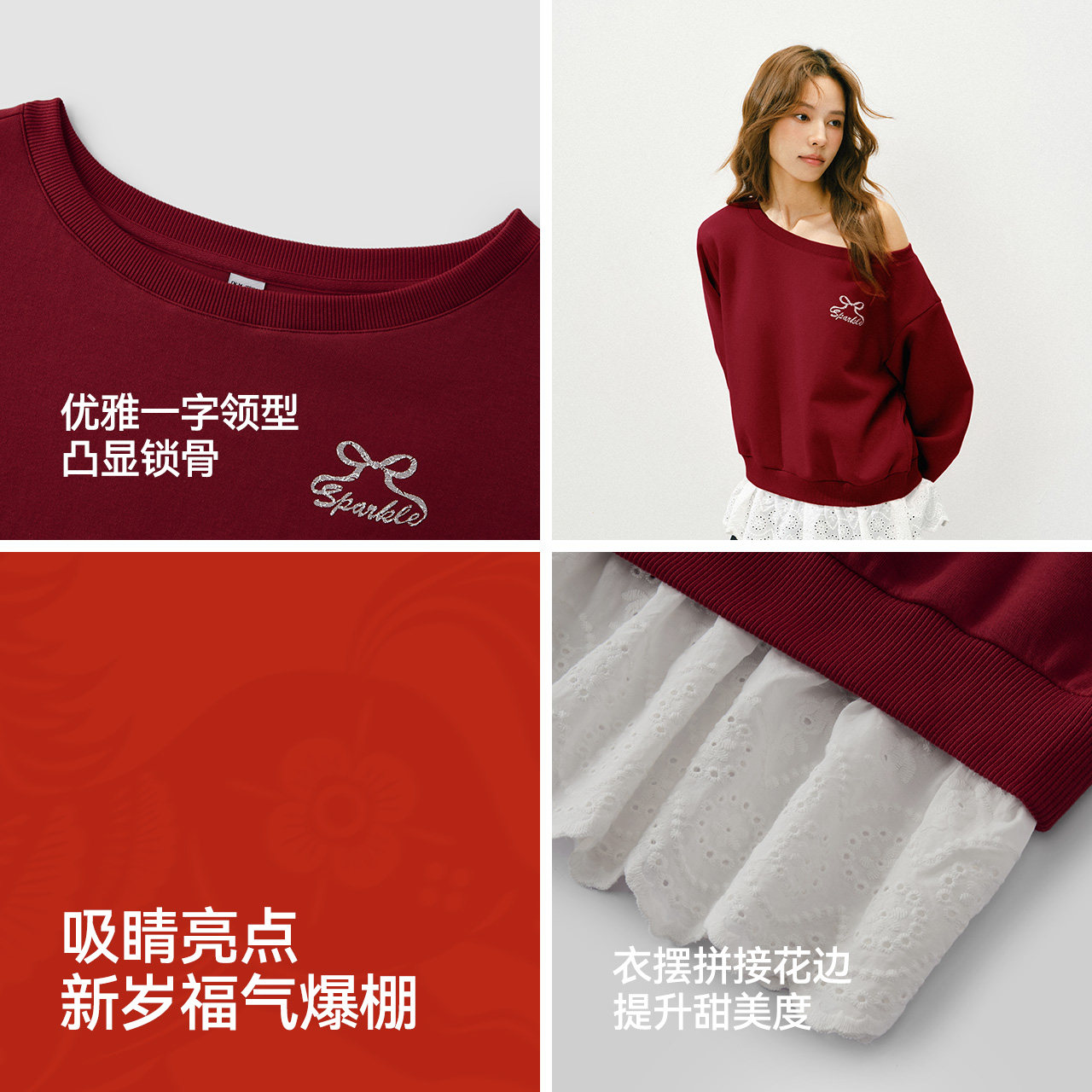 新年红 森马卫衣女一字领假两件斜肩2026新款红色新年小性感衣服