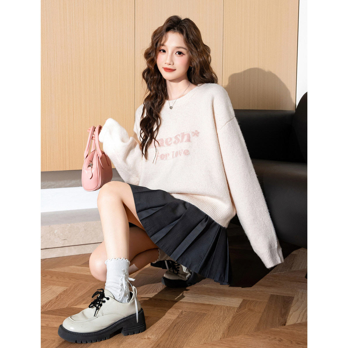 NVPVVA 秋冬百搭LOGO米粒绣圆领毛衣韩系宽松慵懒风针织衫上衣女