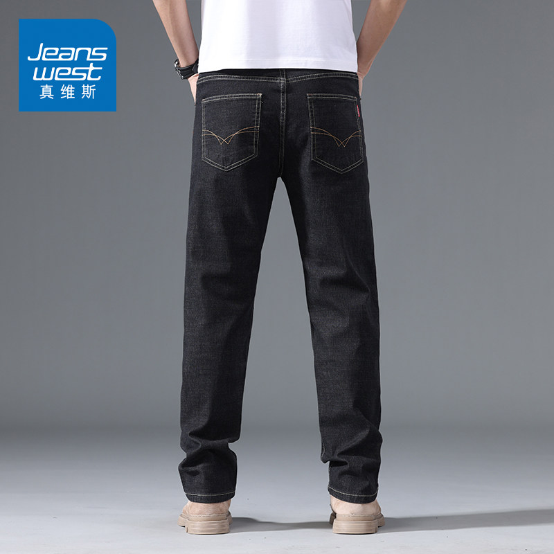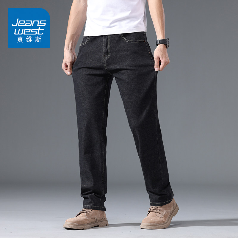KZH真维斯黑色加绒牛仔长裤男士弹力直筒宽松简约百搭男裤子秋冬