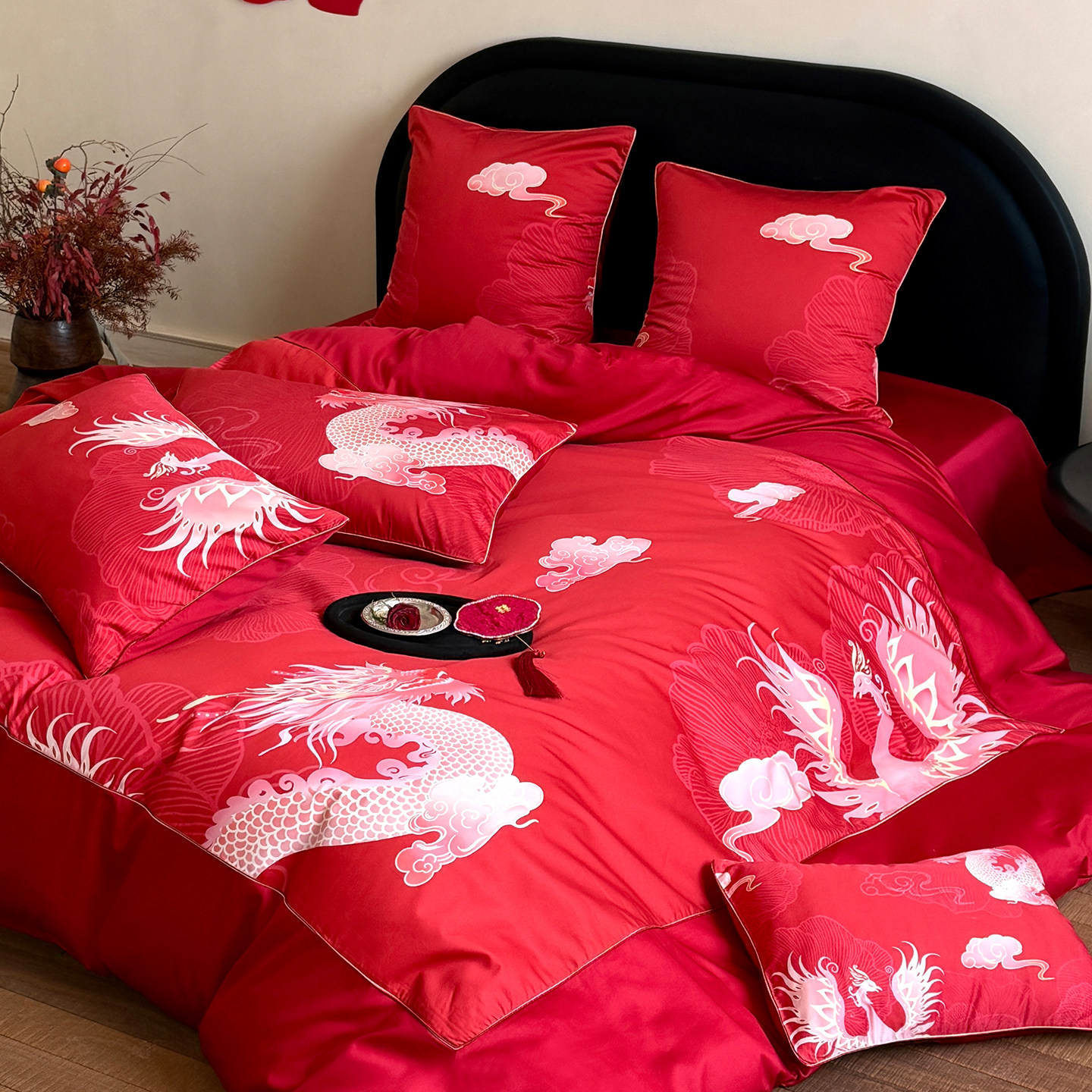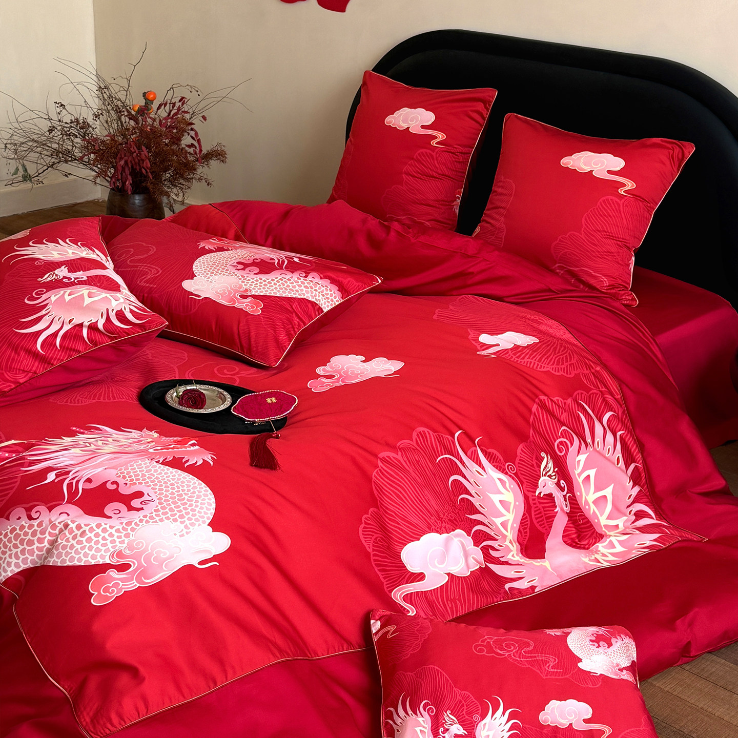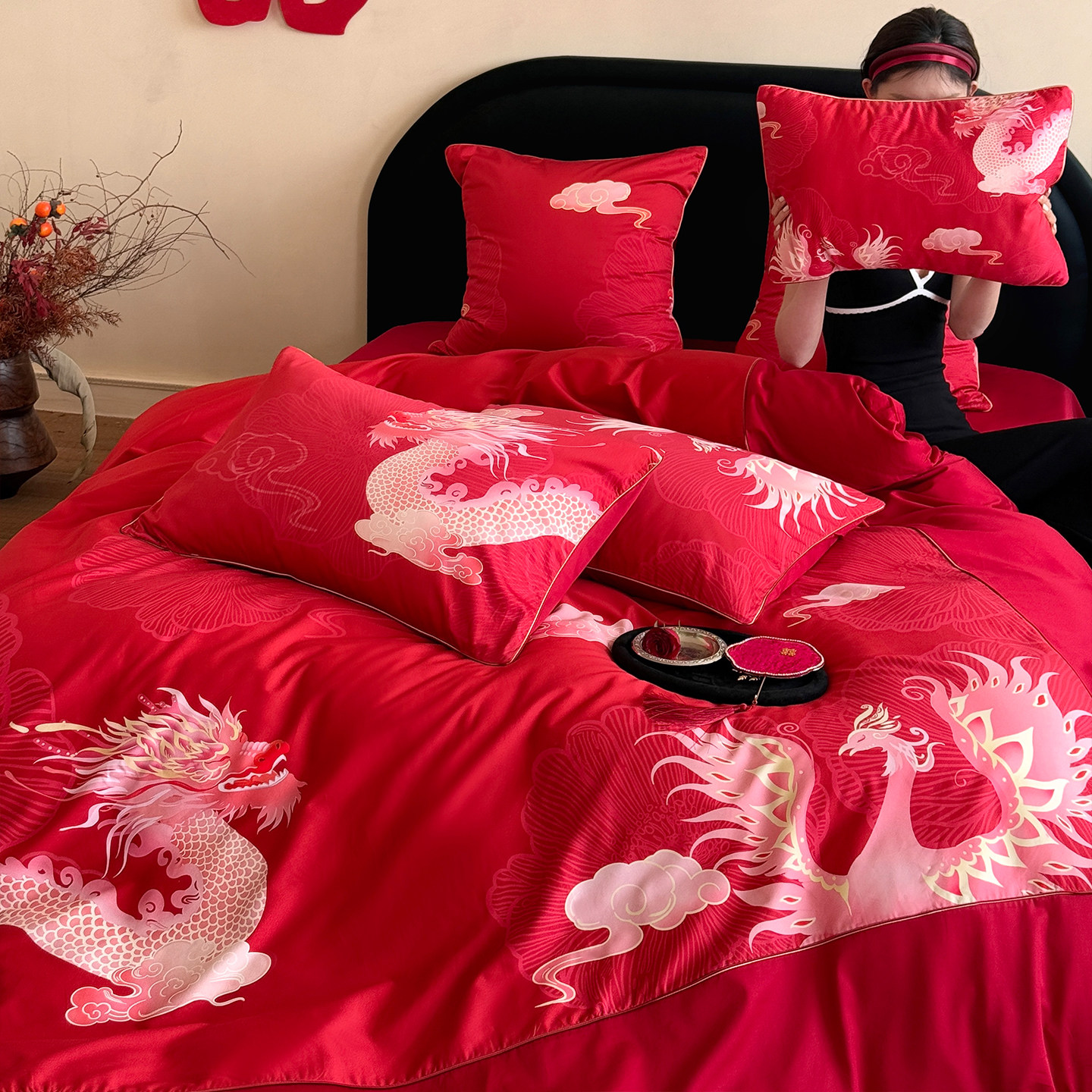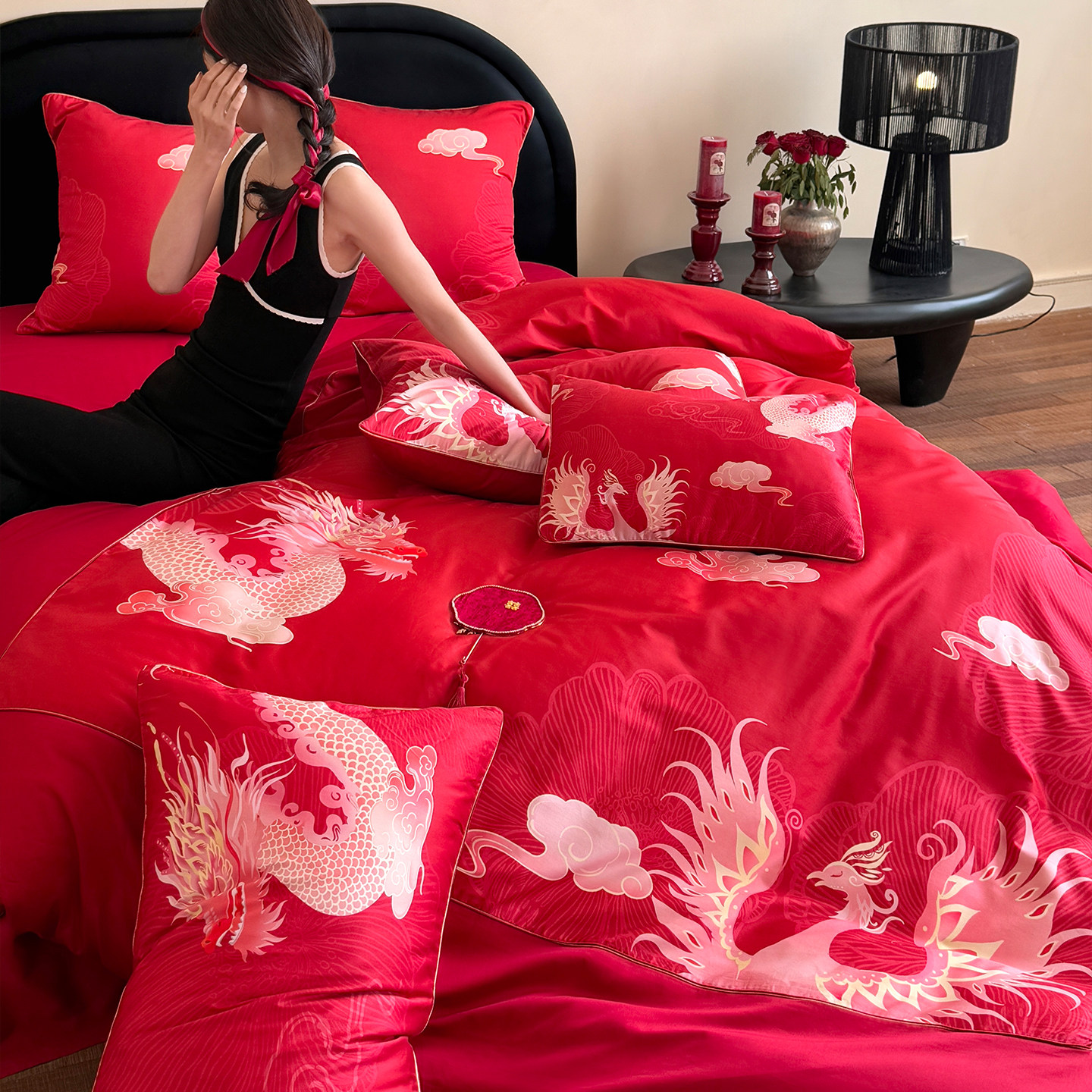 140支高端婚庆四件套长绒棉大红龙凤刺绣全棉新结婚房床品八十件