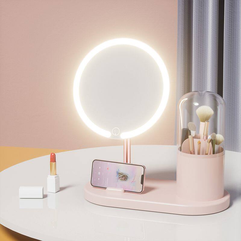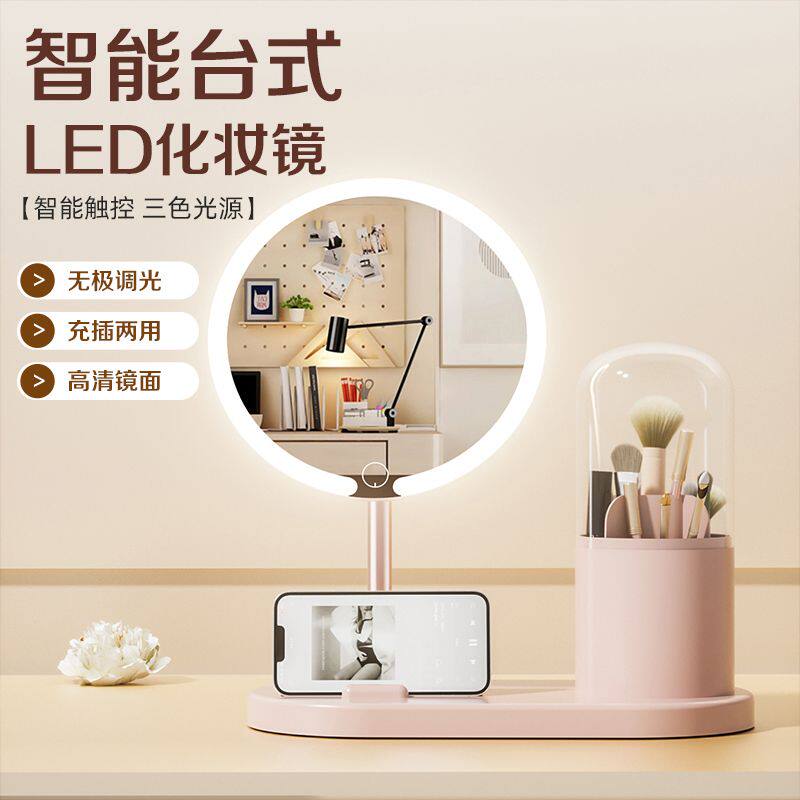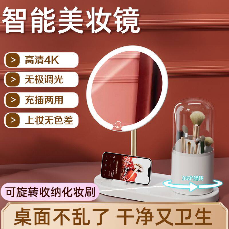 轻奢化妆镜带灯可调节led镜子ins桌面化妆刷工具收纳筒台式梳妆镜