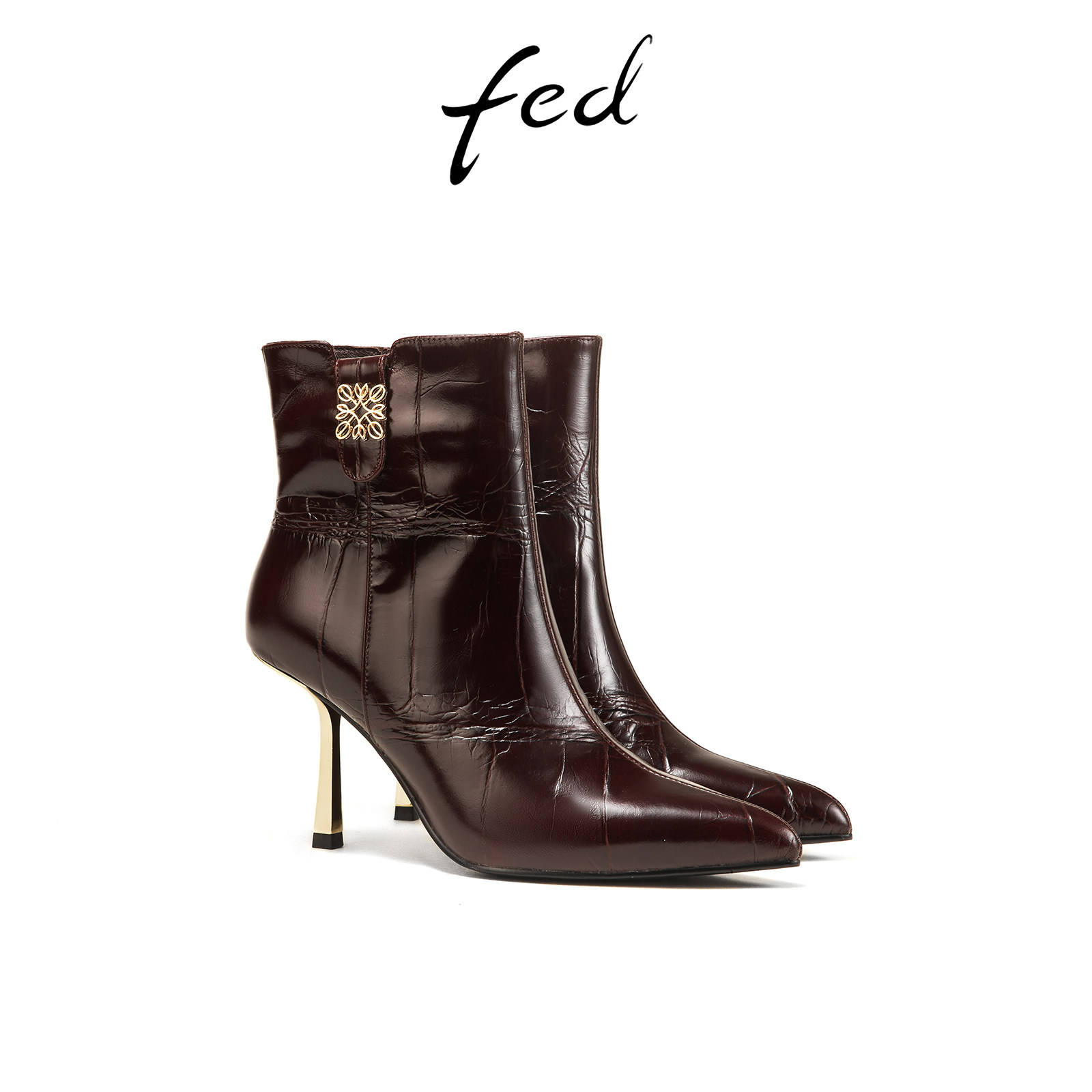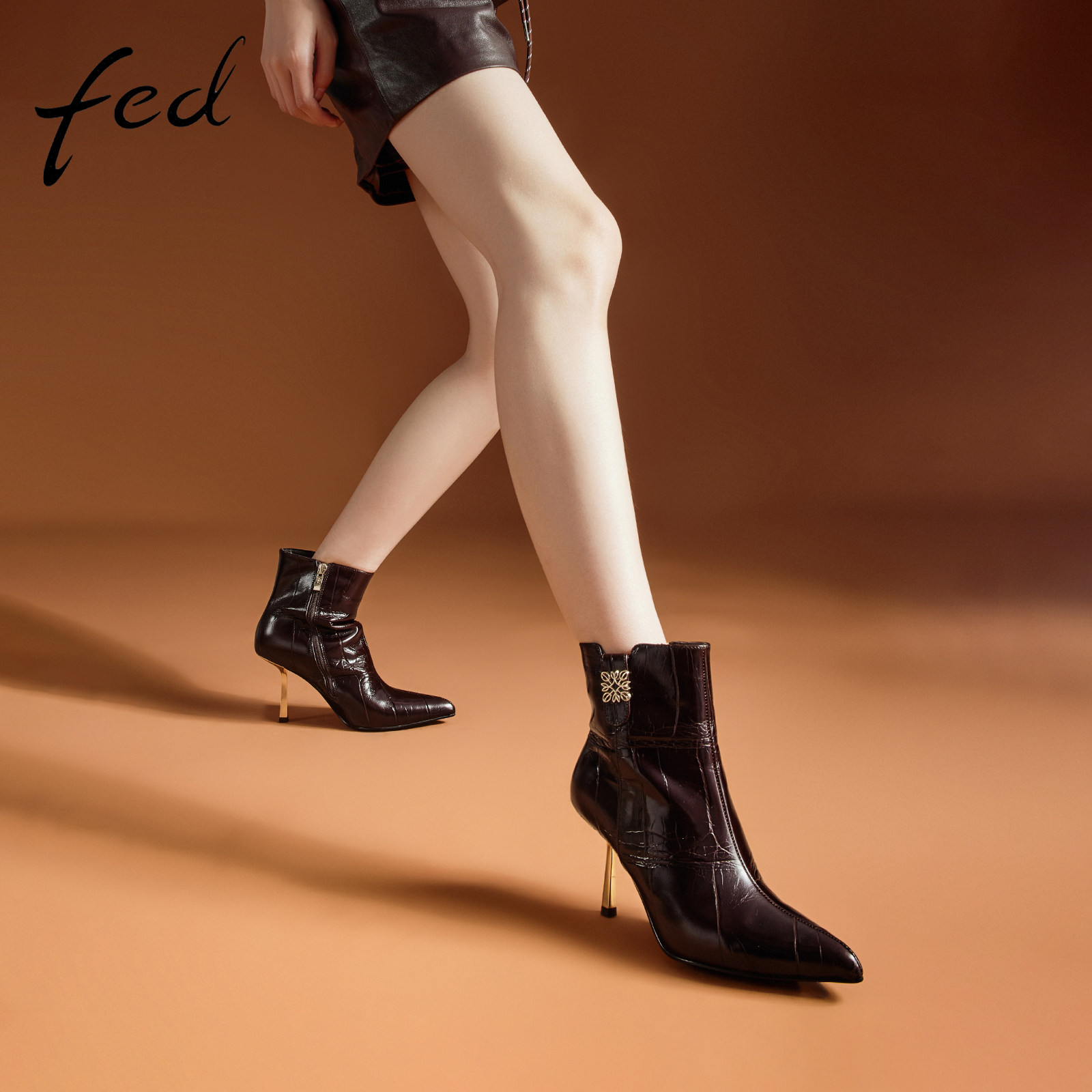 fed法式短靴冬季新款女靴牛皮瘦瘦靴尖头时装靴女款D1017-ZFA153