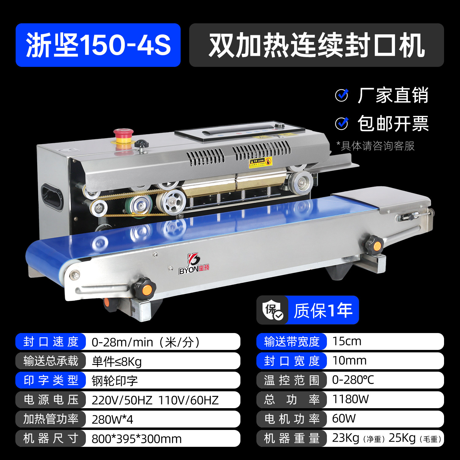 宝预厚袋专用全自动连续封口机商用小型茶叶月饼食品热压机喷码机纯铜加热钢轮印字快食品加工包装设备150-4S