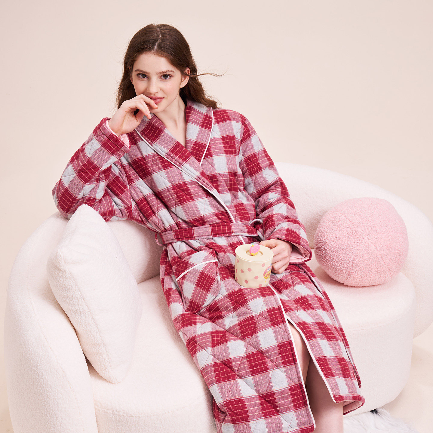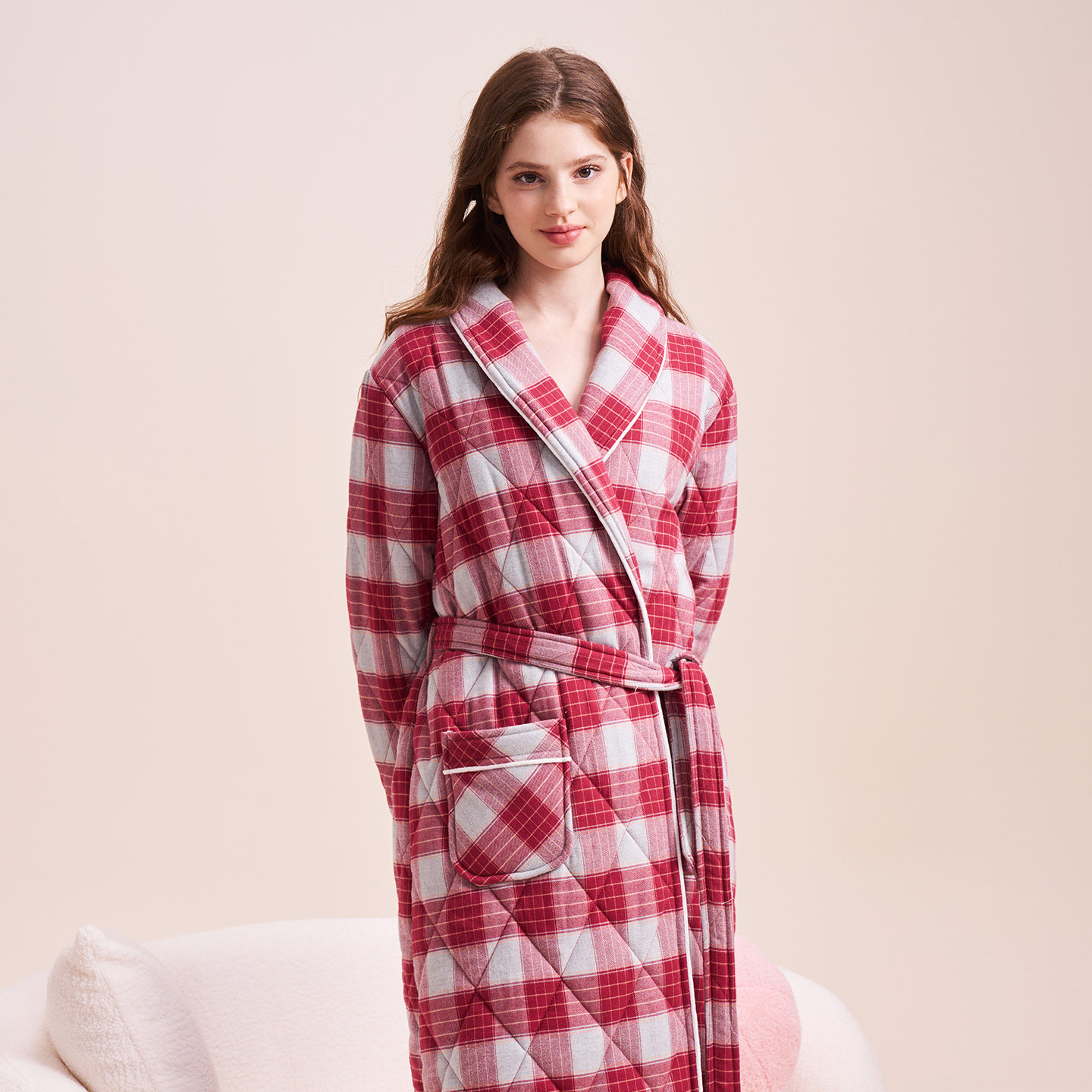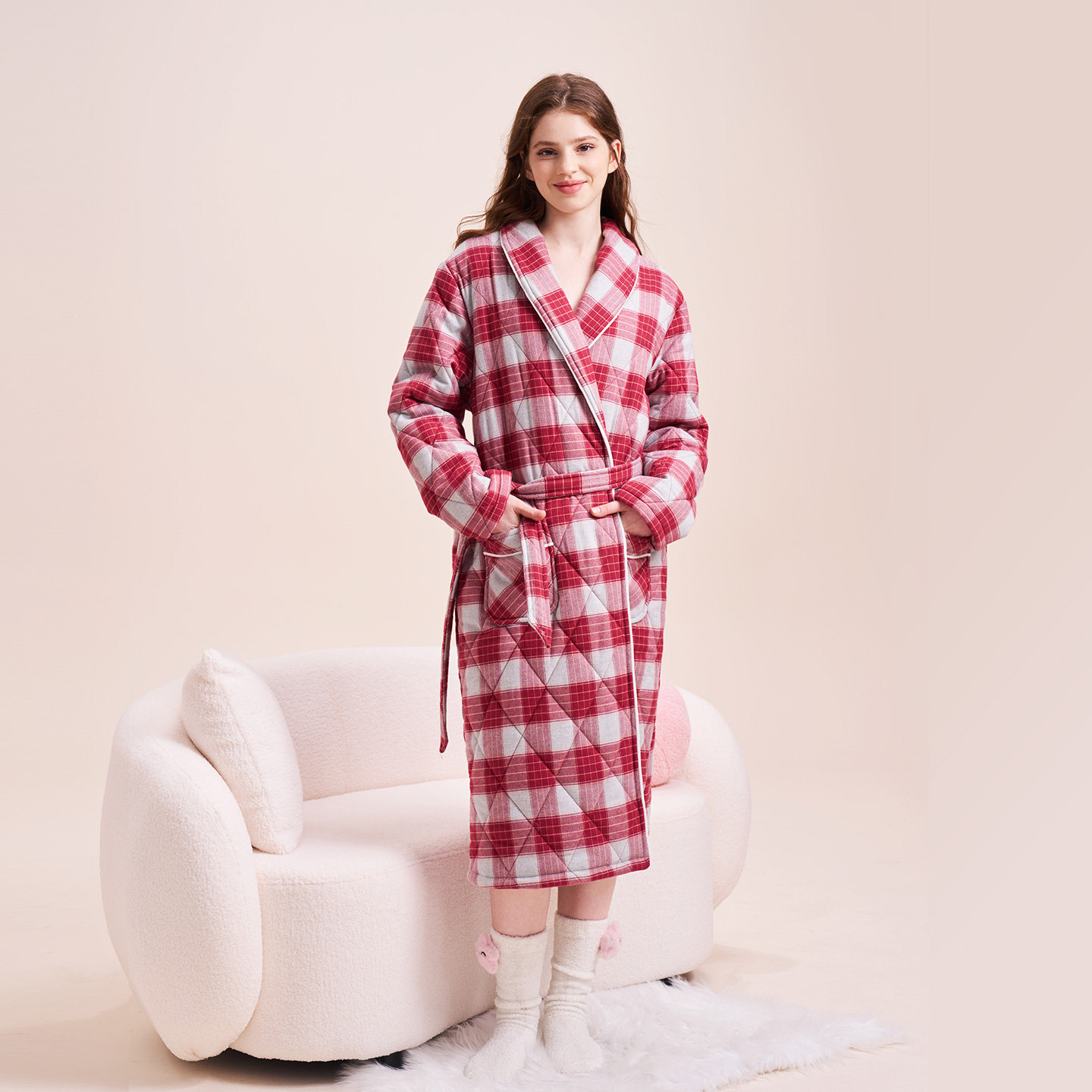 美标三层加厚保暖夹棉睡衣中长款睡袍女可外穿格子休闲全棉家居服