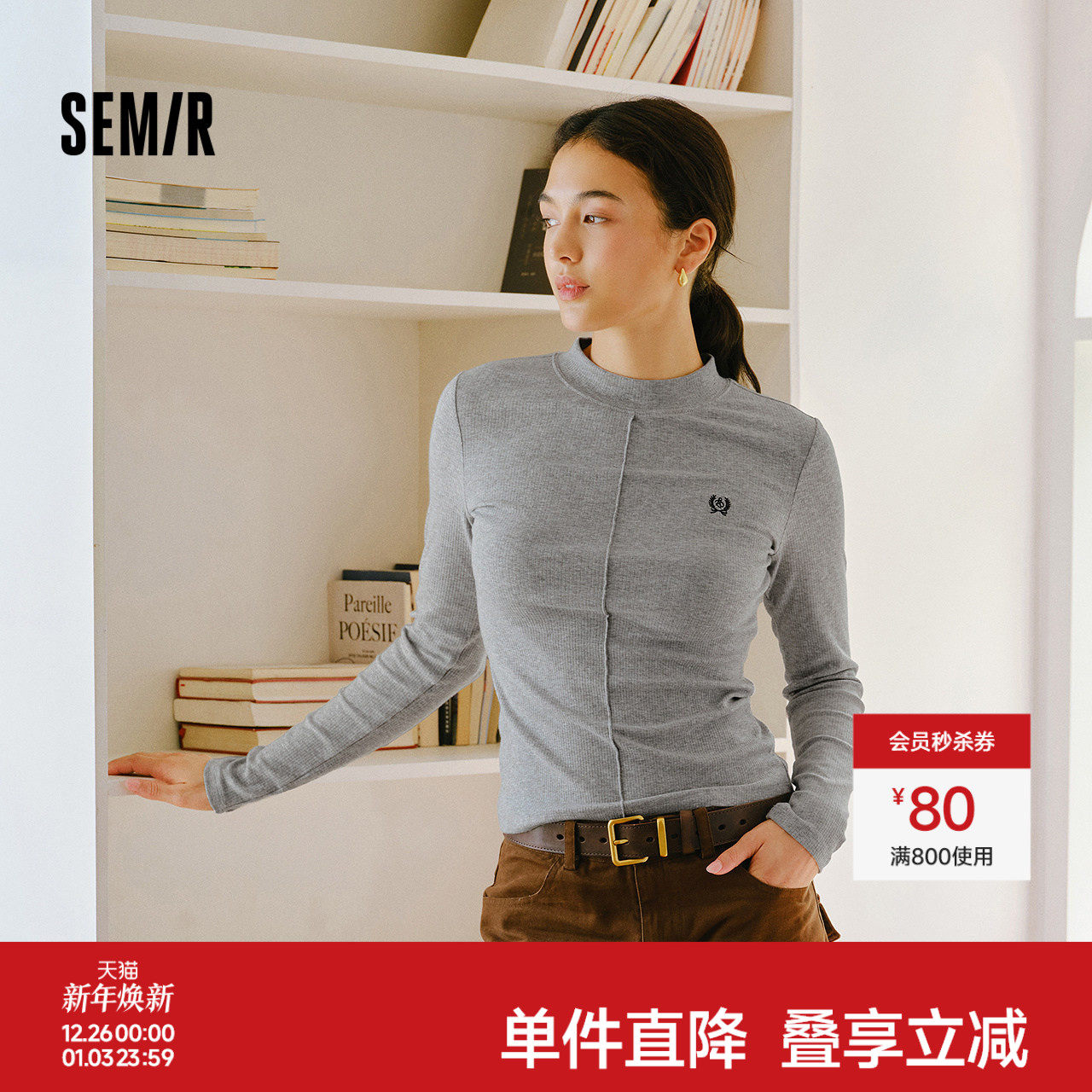 森马长袖T恤女冬半高领小心机分割2025新款刺绣紧身磨毛上衣显瘦