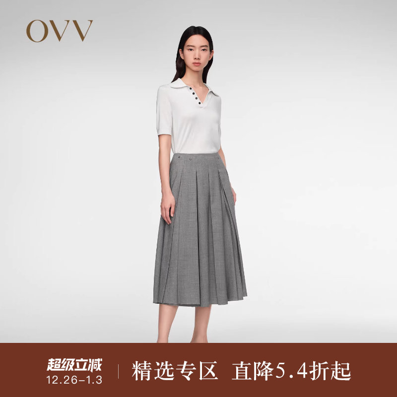 OVV春夏热卖女装羊毛混纺铆钉装饰A字百褶半身裙