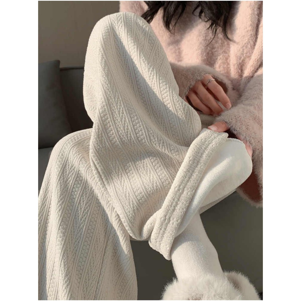 蓝色雪尼尔阔腿裤女秋冬季棉裤高腰宽松直筒窄版休闲加绒裤子大码