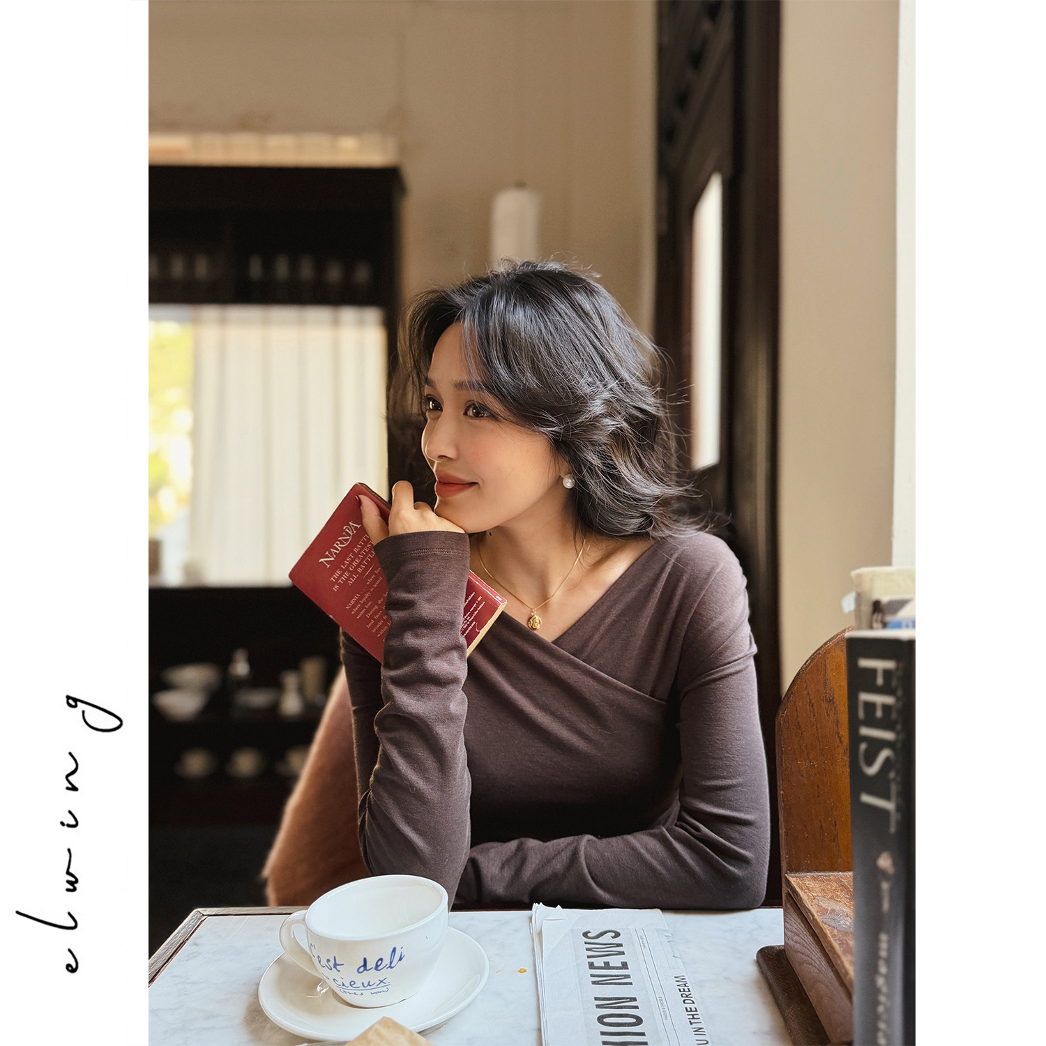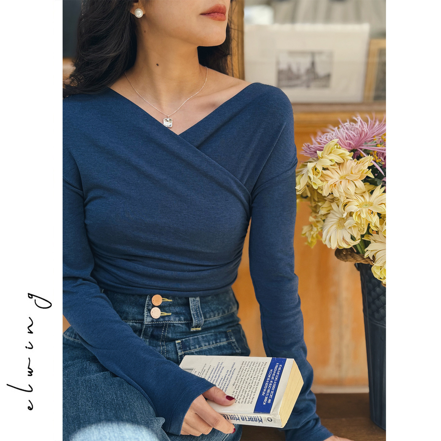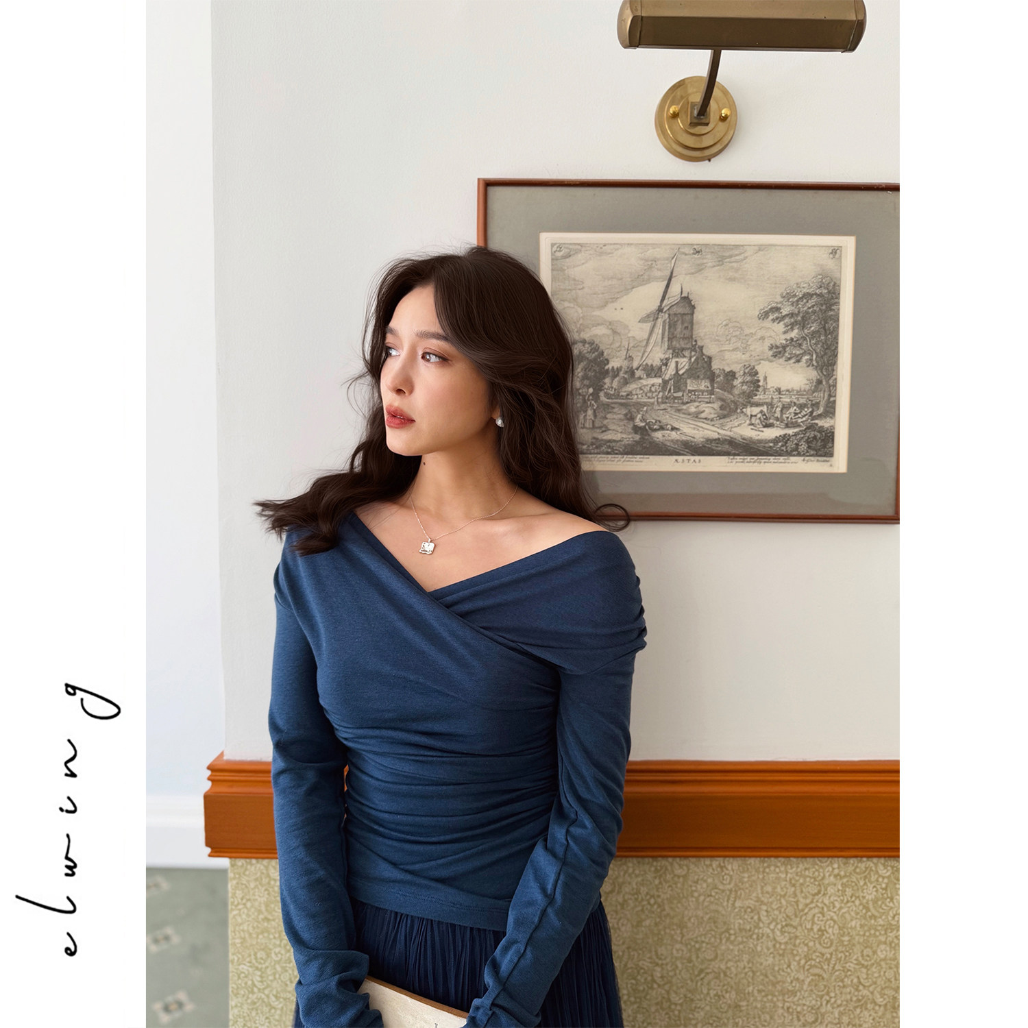 Elwing原创天丝羊毛浪漫一字肩V领褶皱设计感显瘦打底衫上衣