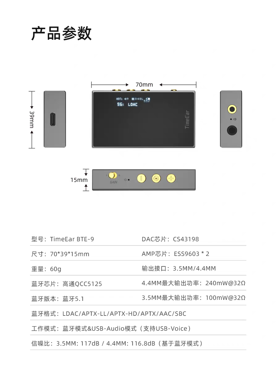 TimeEar BTE9带屏蓝牙解码耳放便携DAC高清通话HIFI发烧 送背夹