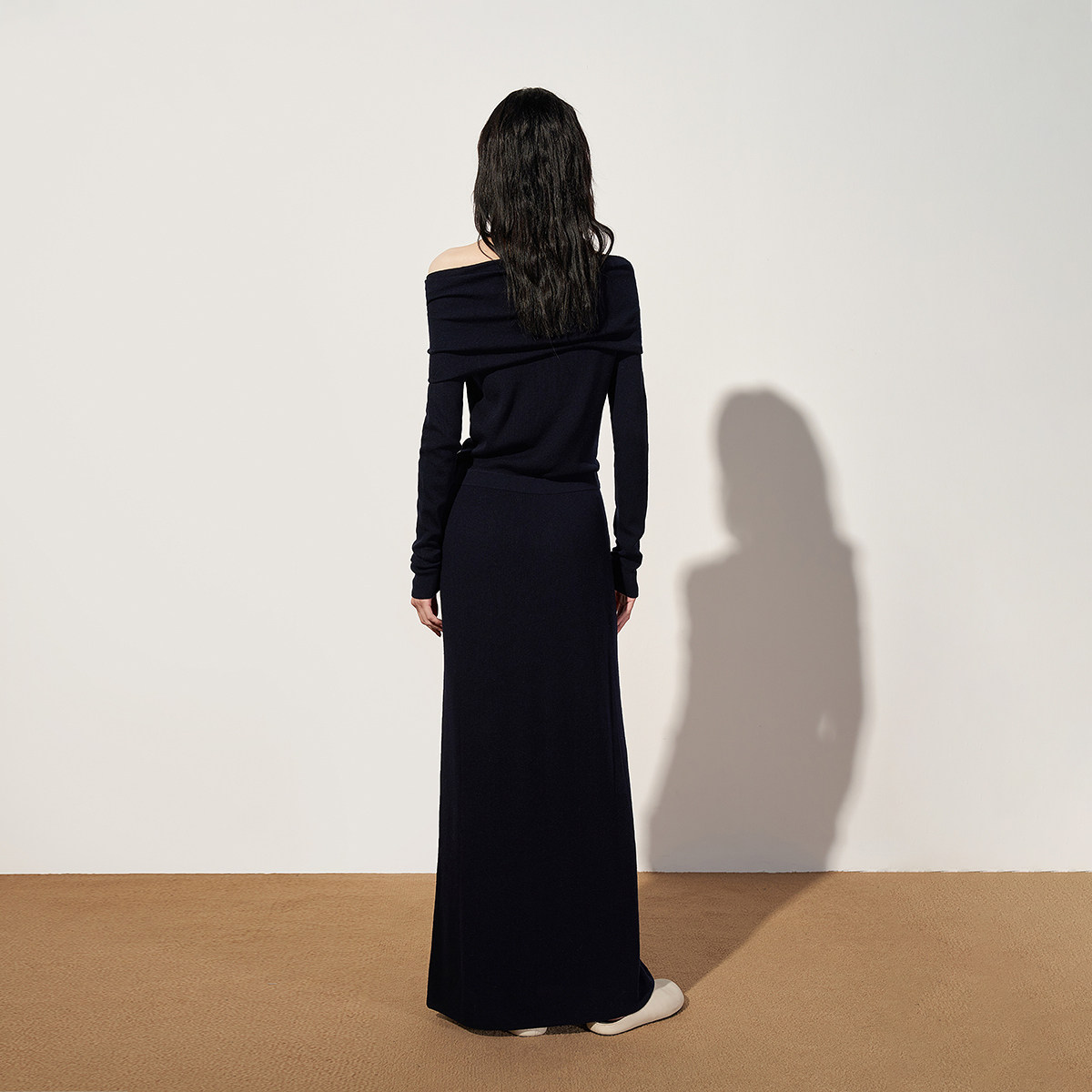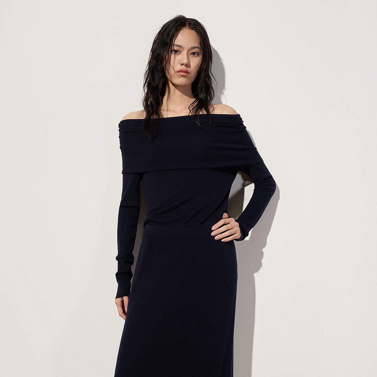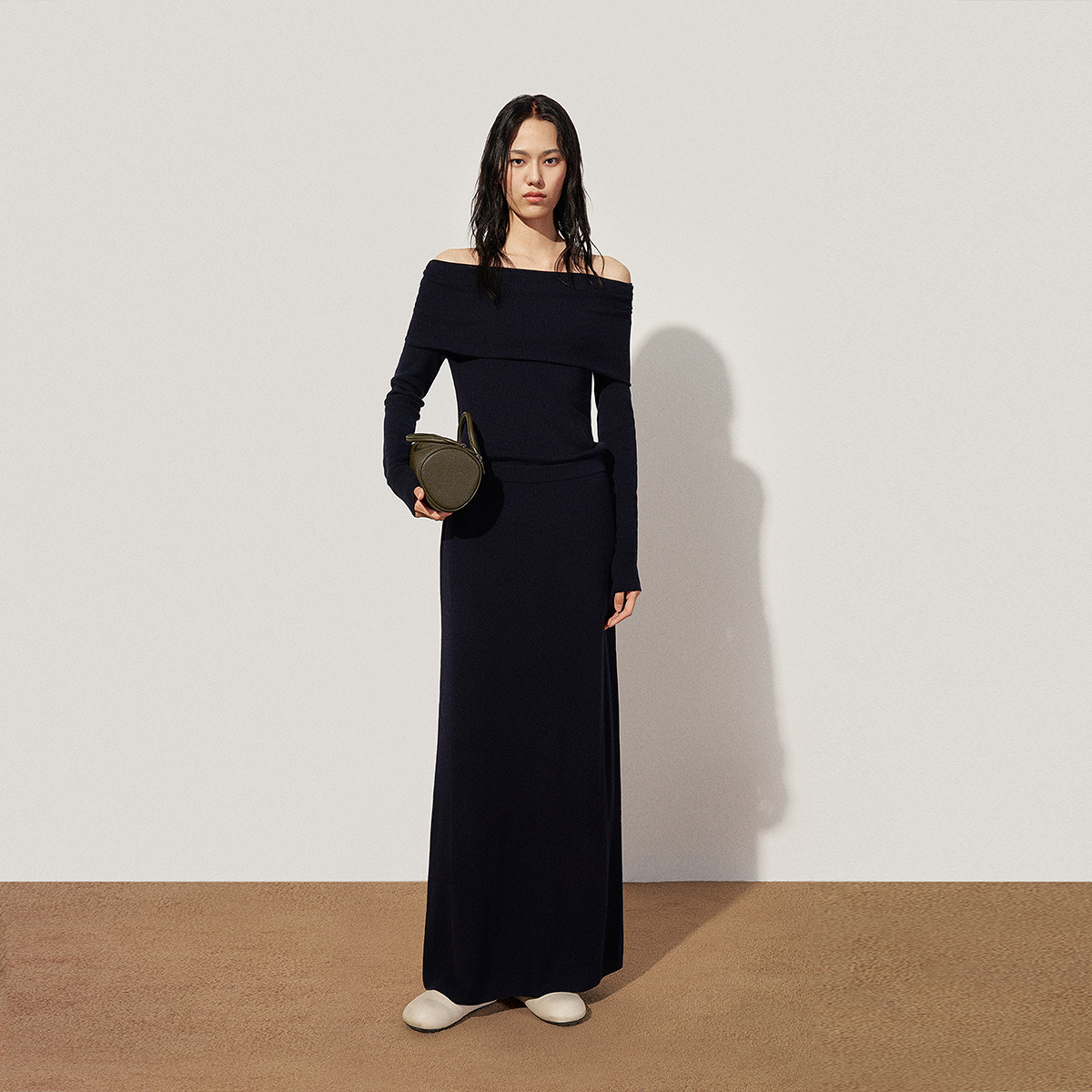 【新品】OCHIRLY欧时力100%羊毛一字领毛织连衣裙长裙露肩25秋冬