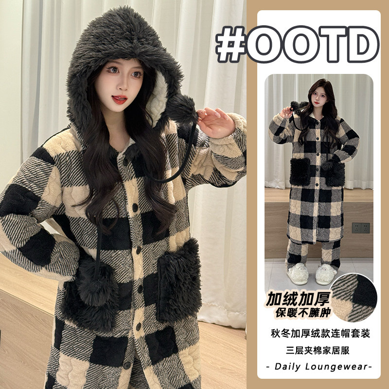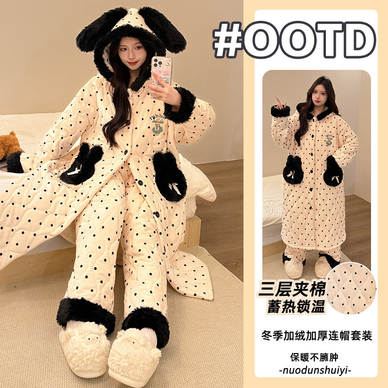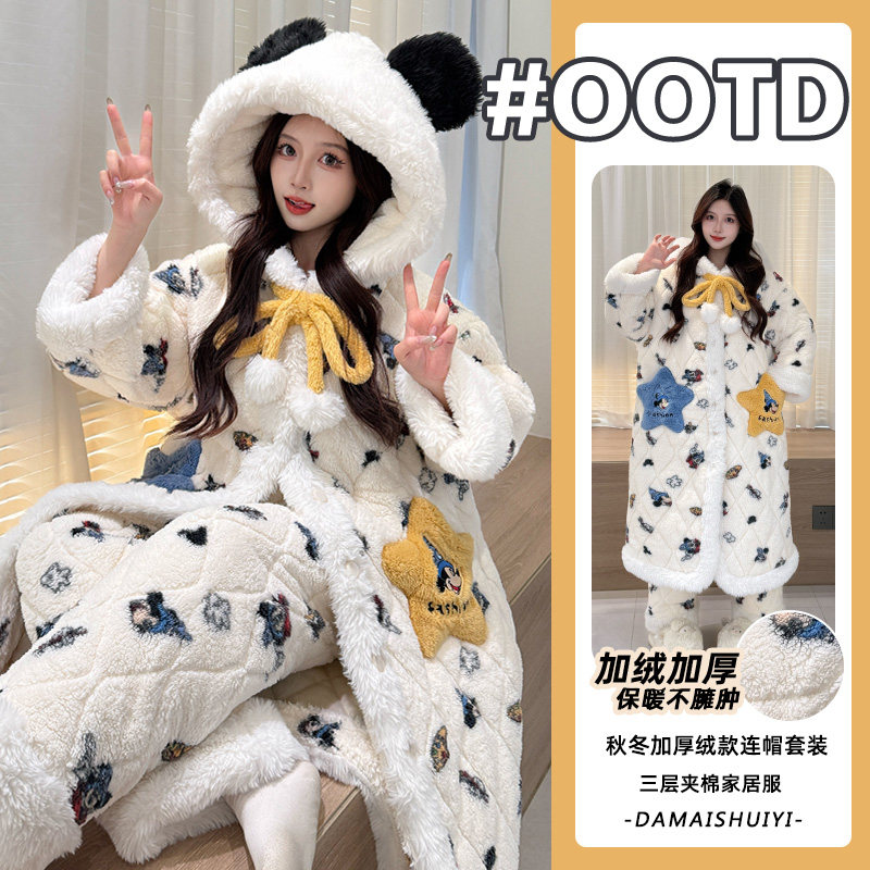 新款冬季三层夹棉加绒加厚保暖可爱帕恰狗连帽可外穿休闲睡袍套装