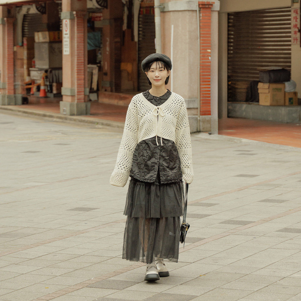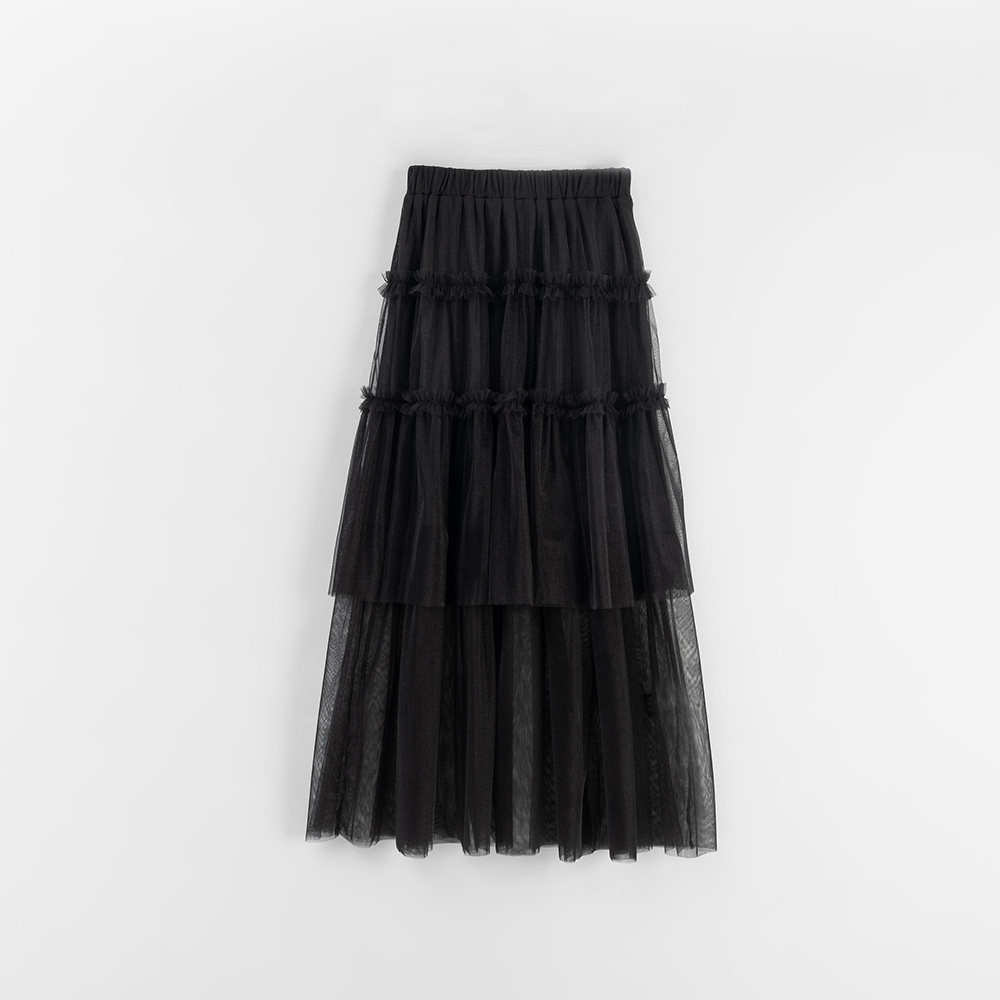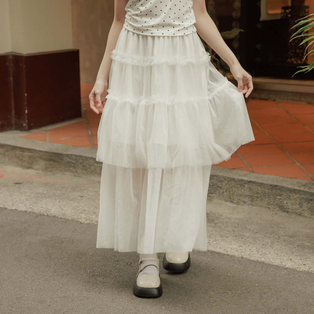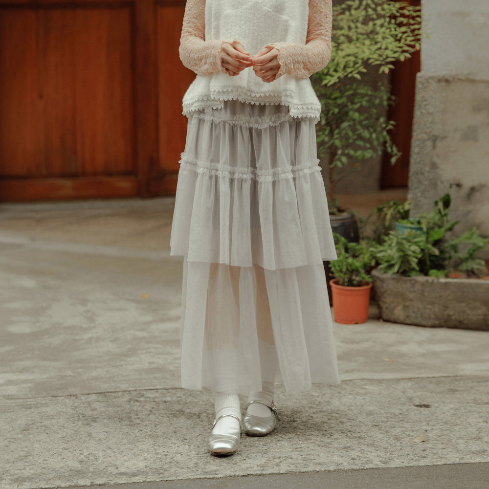 QUEENSHOP 2026春夏新品女装光泽透纱蛋糕剪接造型长裙03021726