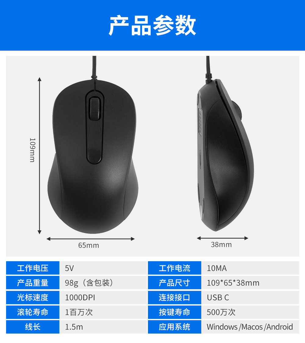 Type-c有线鼠标USB办公简约静音通用于联想华硕苹果笔记本台式机