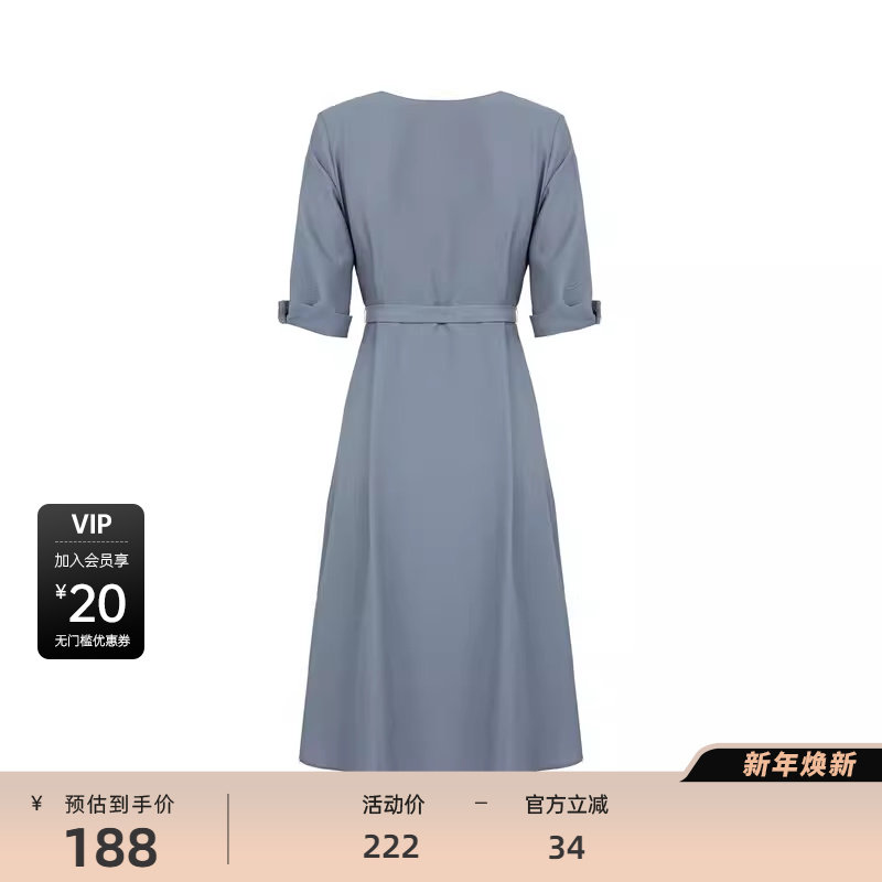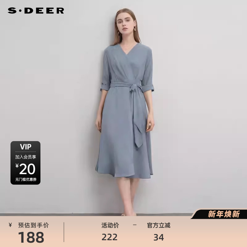 sdeer圣迪奥女装秋V领压褶收腰不规则雪纺连衣裙S233Z1286