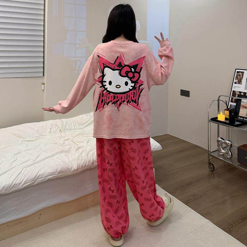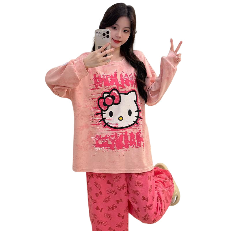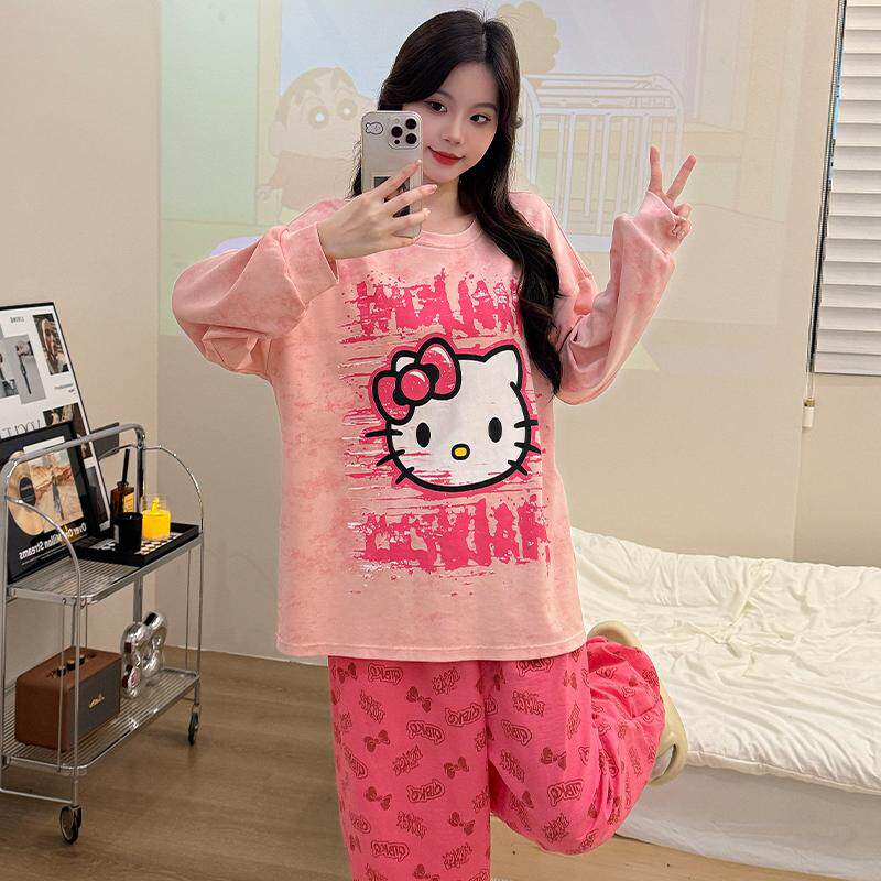 2026新款KT猫睡衣女长袖春季长裤带胸垫卡通可爱家居服亲肤可外穿