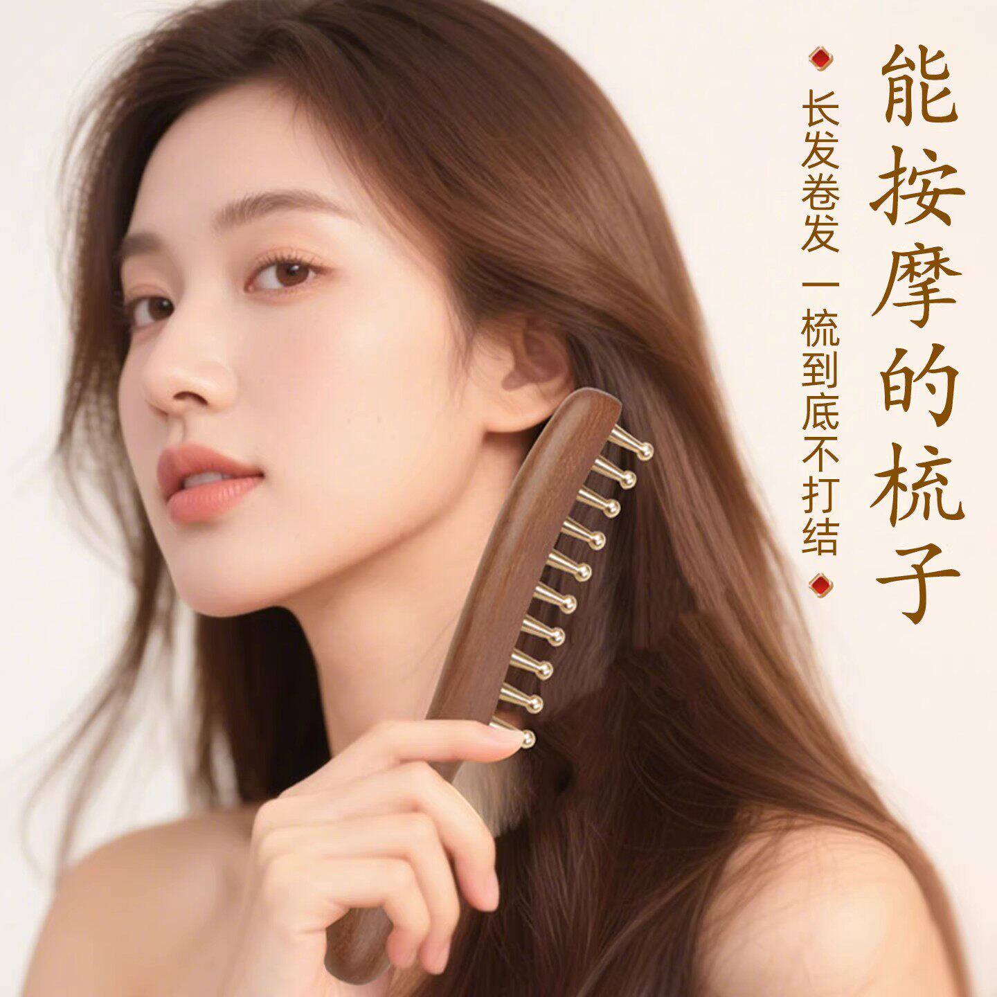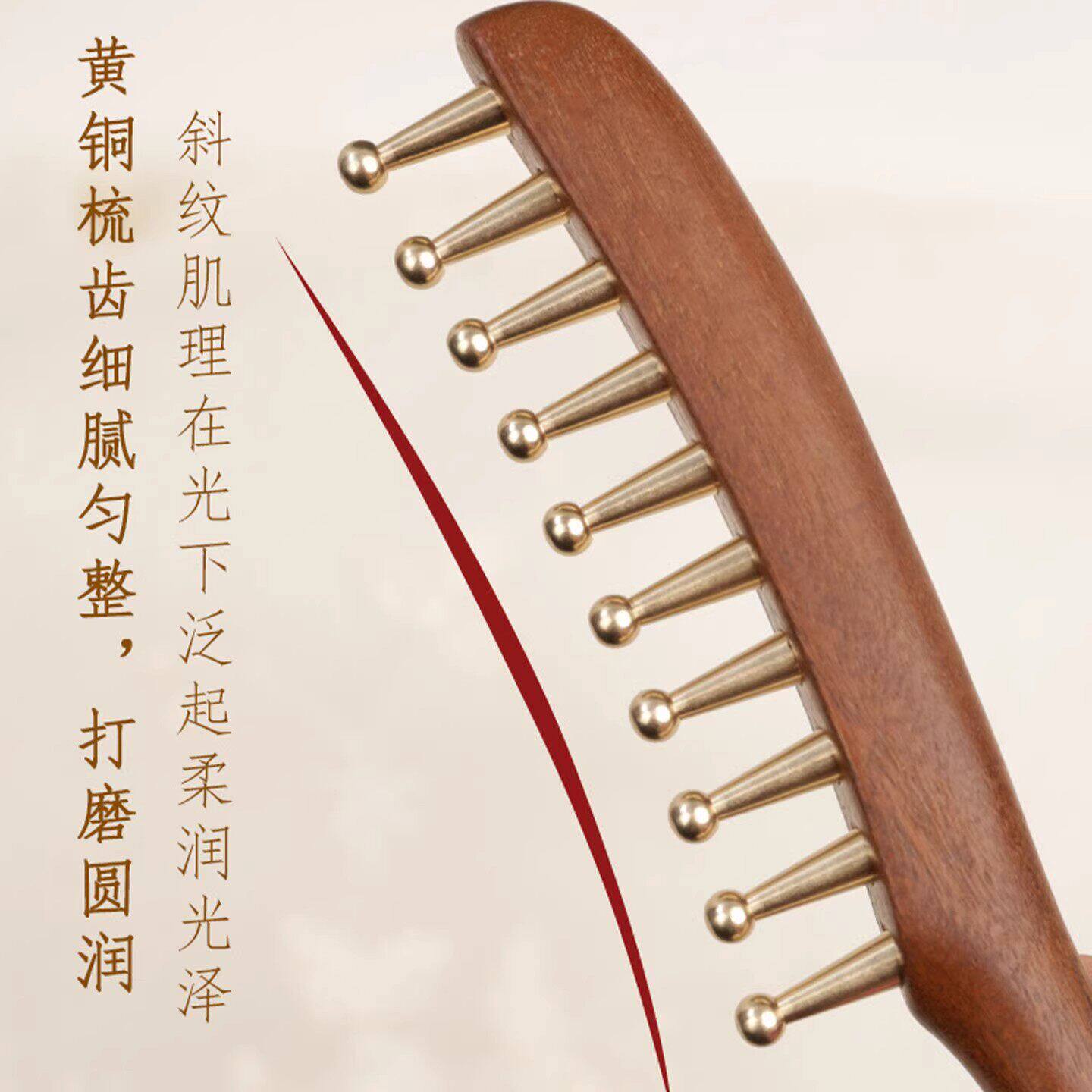 黄铜头部按摩梳子经络疏通大齿拨筋棒头皮头疗养生刮痧宽齿梳檀木