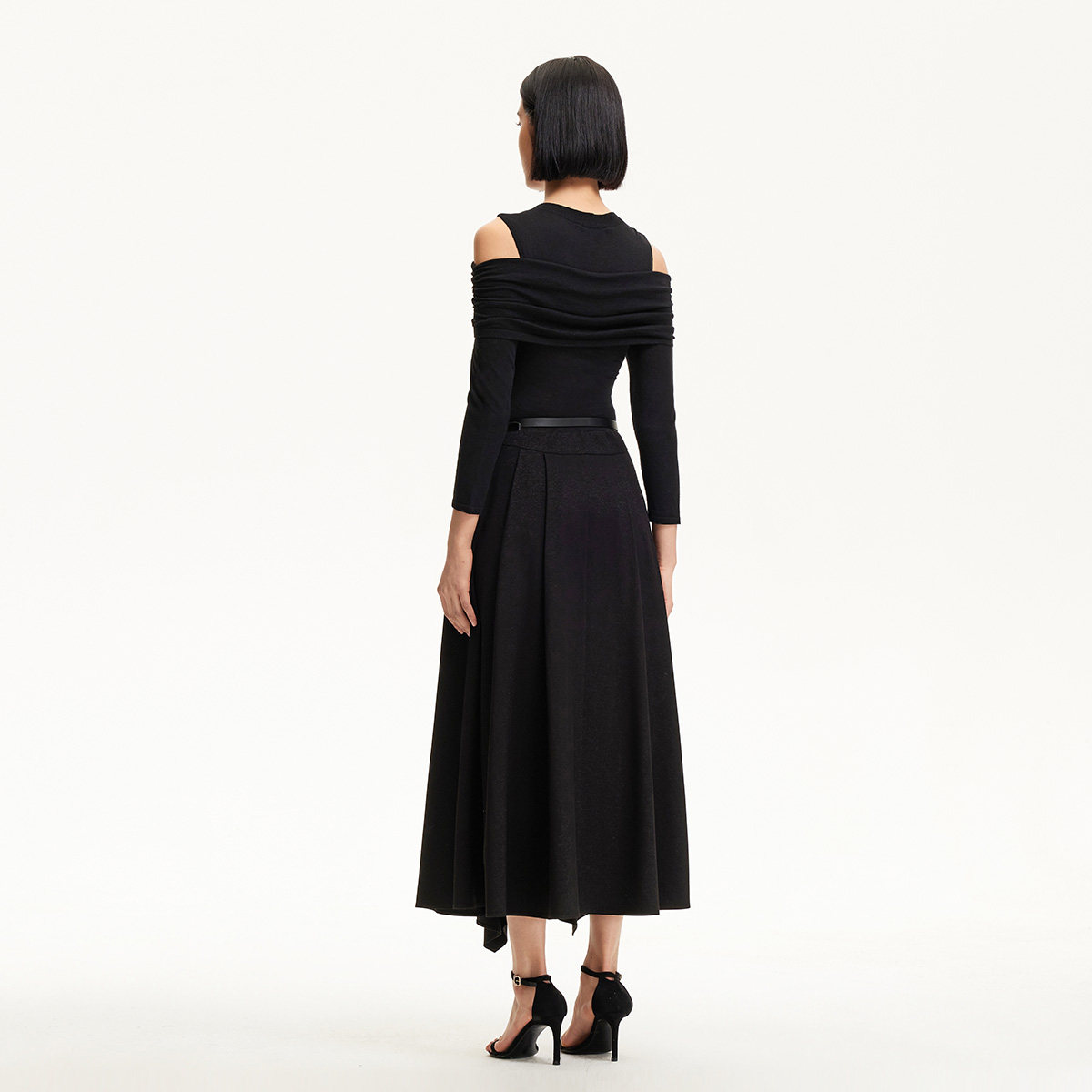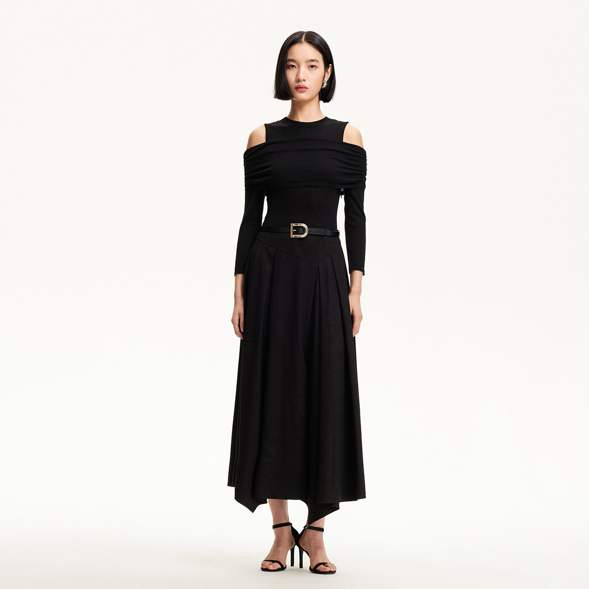 Vero Moda连衣裙2025春季新款露肩腰带带闪面料拼接长裙32517C004
