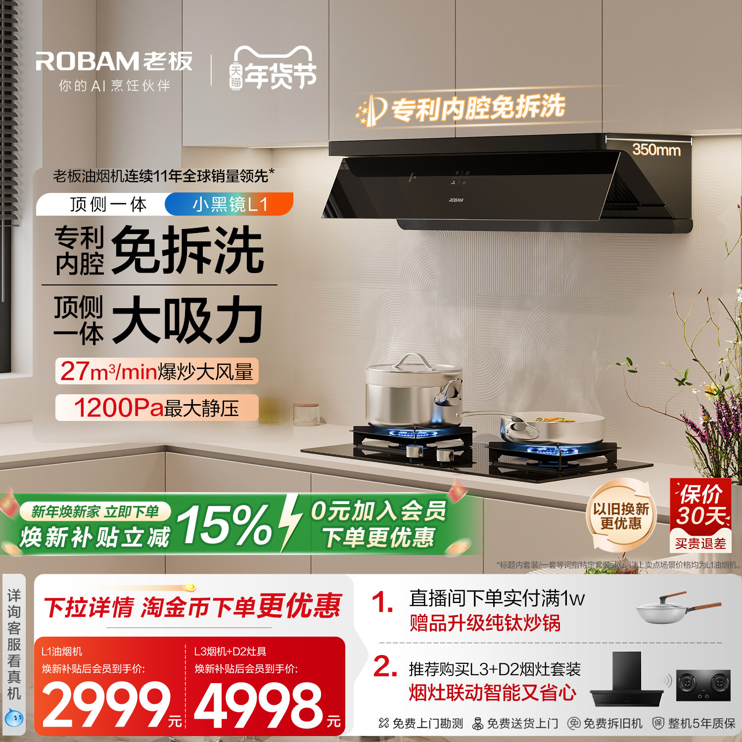 【顶侧一体】老板小黑镜L1/L3/L1mini油烟机燃气灶套装官方旗舰店