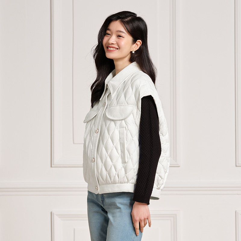 坦博尔奥莱官方正品小香风羽绒马甲女短款轻薄无袖拼接翻领外套潮