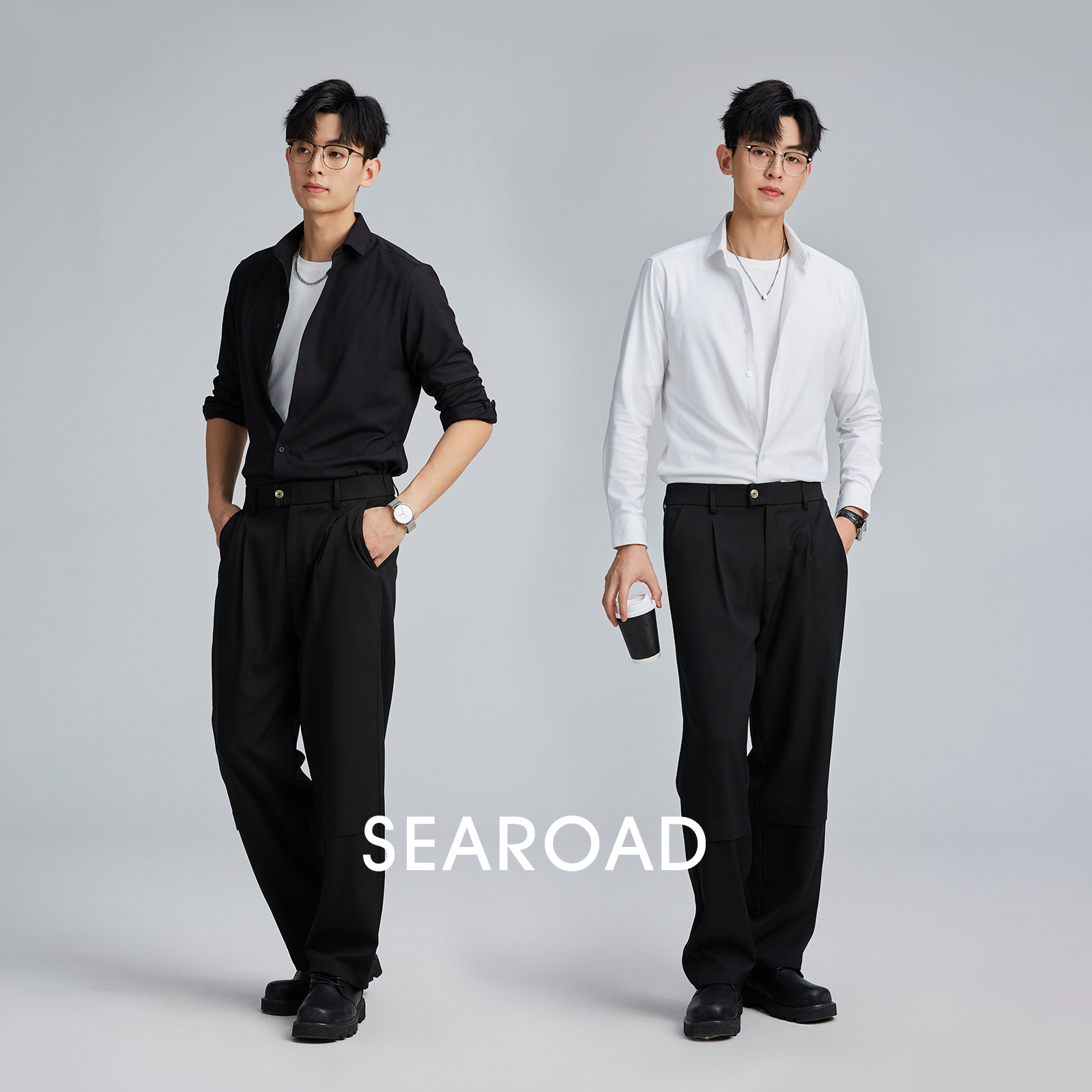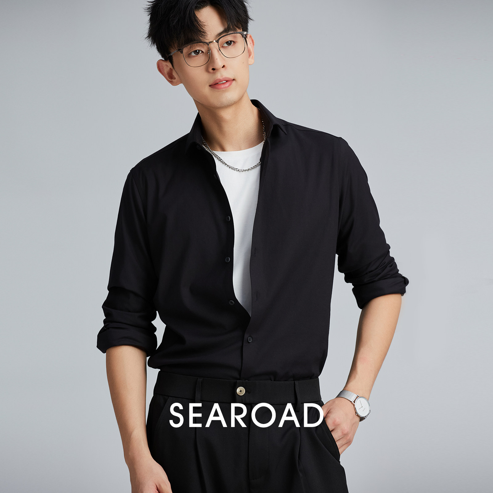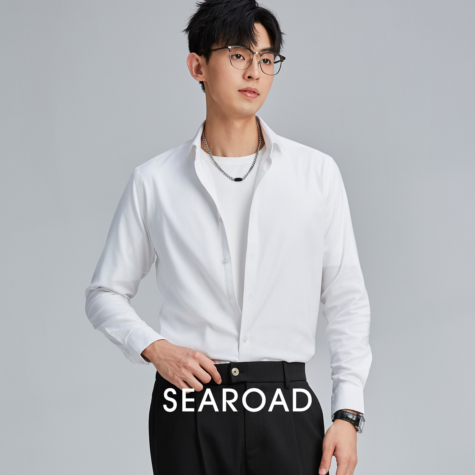 海上公路旗舰店莫代尔混纺羊毛衬衫男士休闲商务帅气职业正装衬衣