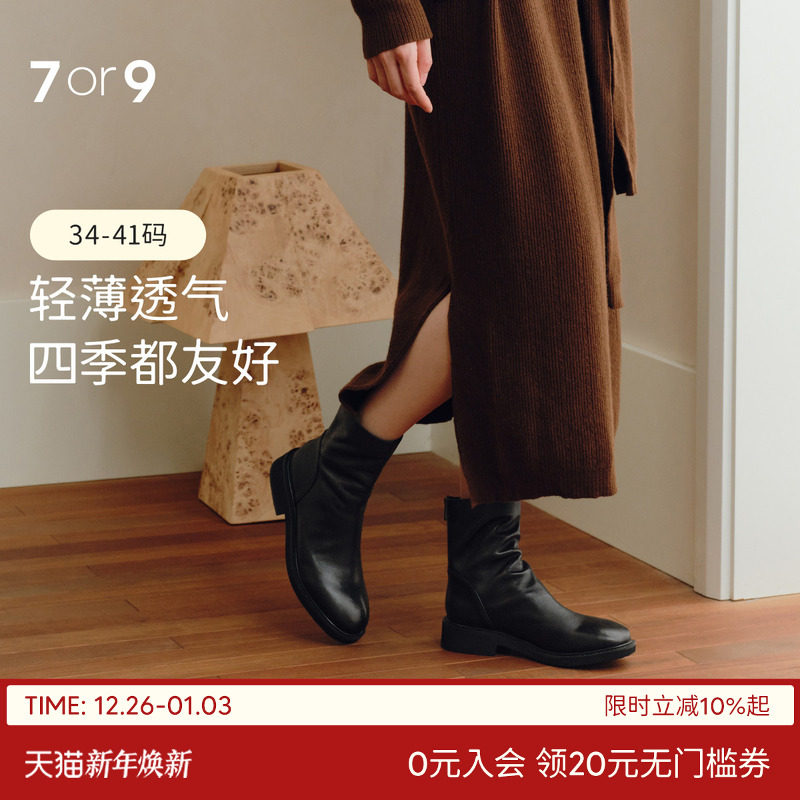 7or9短靴女鞋秋冬新款真皮圆头短筒粗跟靴子瘦瘦靴堆堆靴黑色芭菲