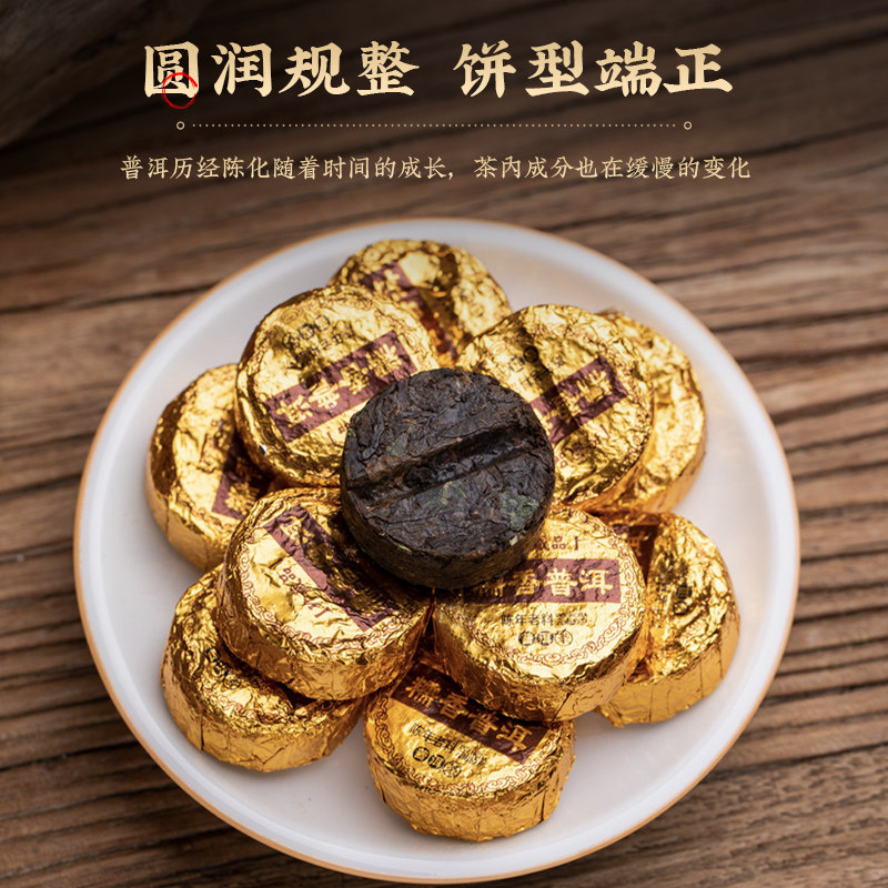 宫明茶叶 云南普洱茶熟茶糯米香小金砖普洱熟茶小圆饼320克礼盒装