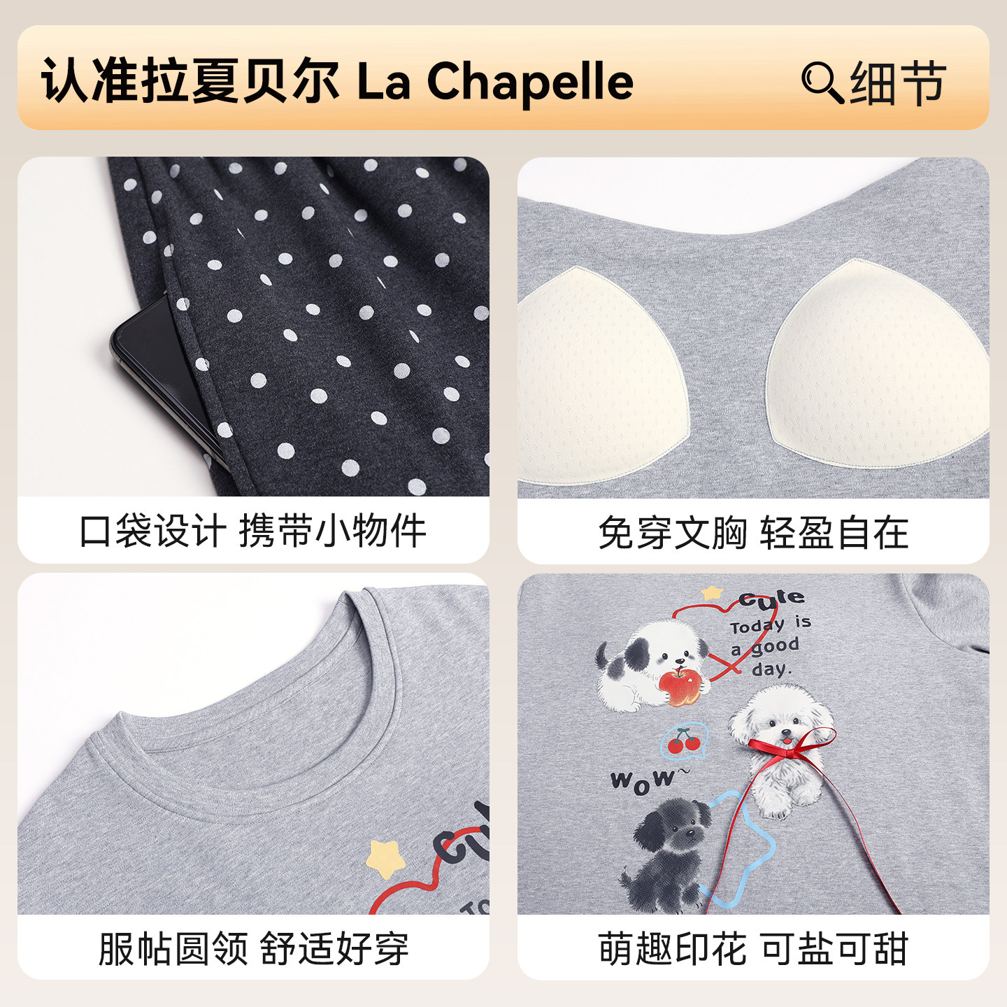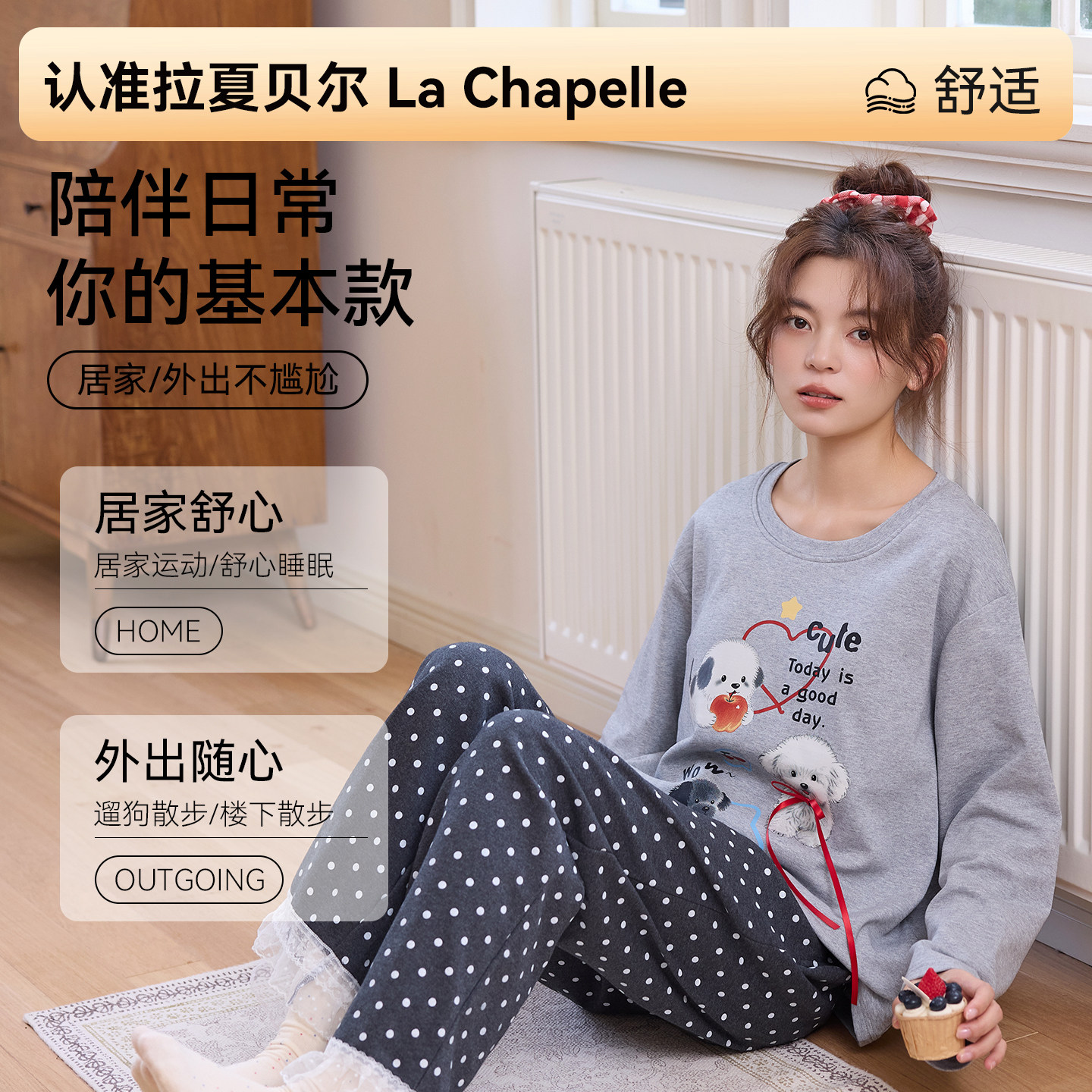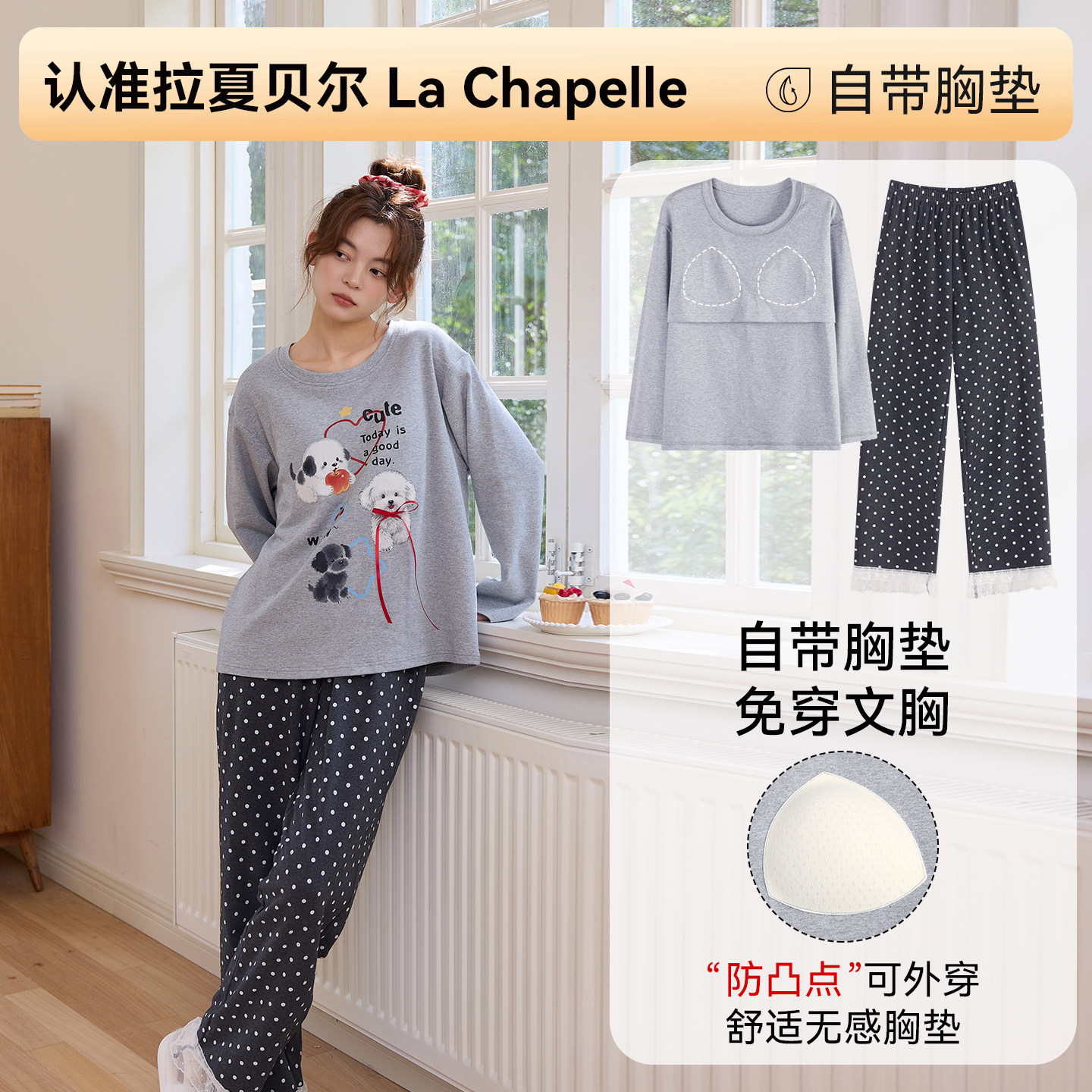 拉夏贝尔纯棉睡衣女款2026春秋季新款带胸垫可外出女士家居服套装