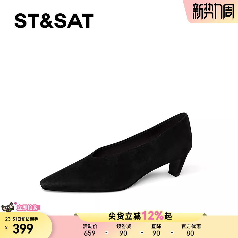 星期六黑色单鞋女2025简约尖头粗跟浅口V口工作鞋百搭通勤奶奶鞋