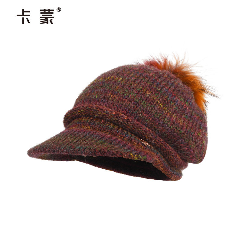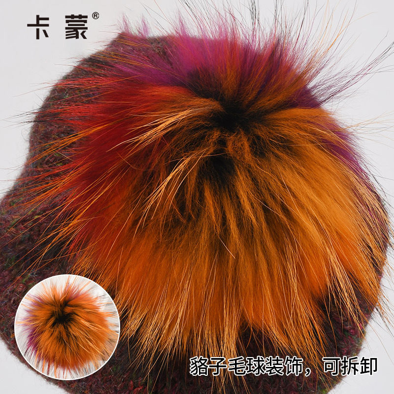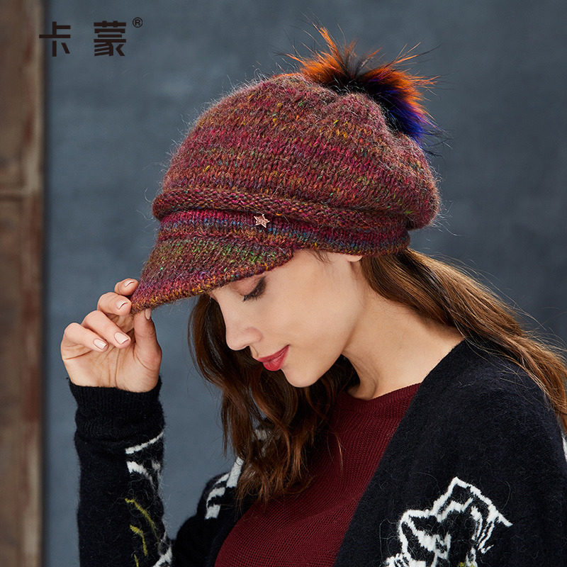 卡蒙马海毛混纺毛线帽子可拆卸貉子毛球鸭舌帽堆堆帽女秋冬针织帽