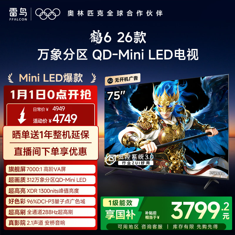 TCL雷鸟鹤626款75英寸QD-MiniLED高阶VA屏电视机以旧换新补贴85