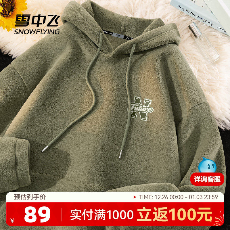 雪中飞摇粒绒卫衣男2025新款冬季加厚颗粒绒套头外套男士连帽衫PC