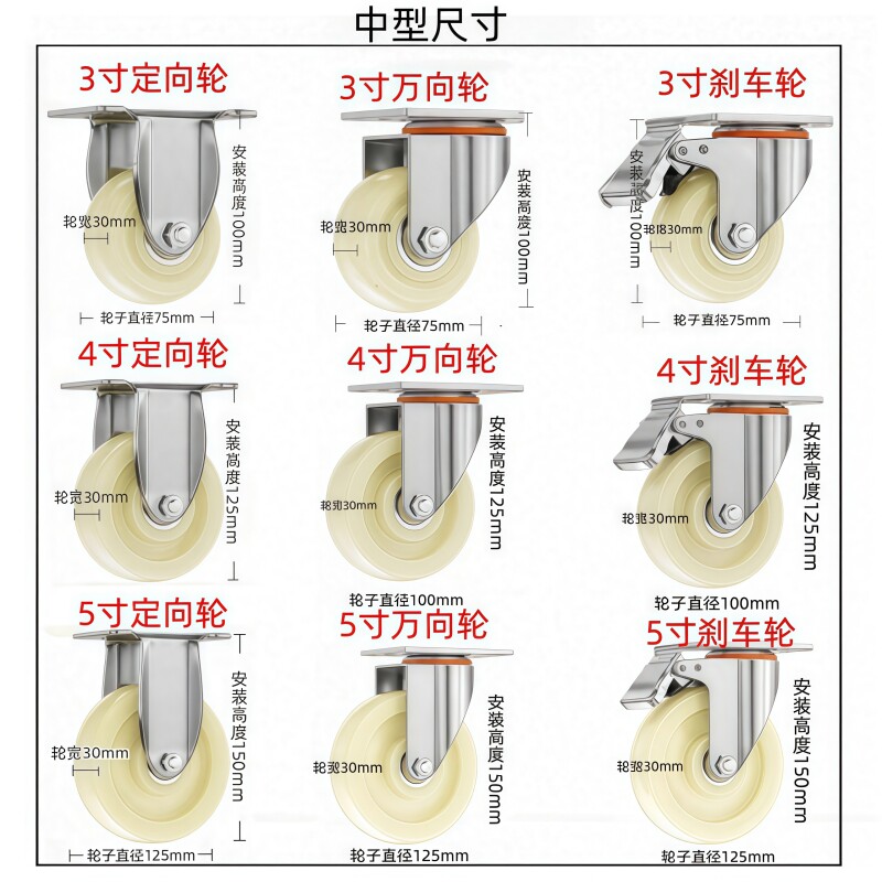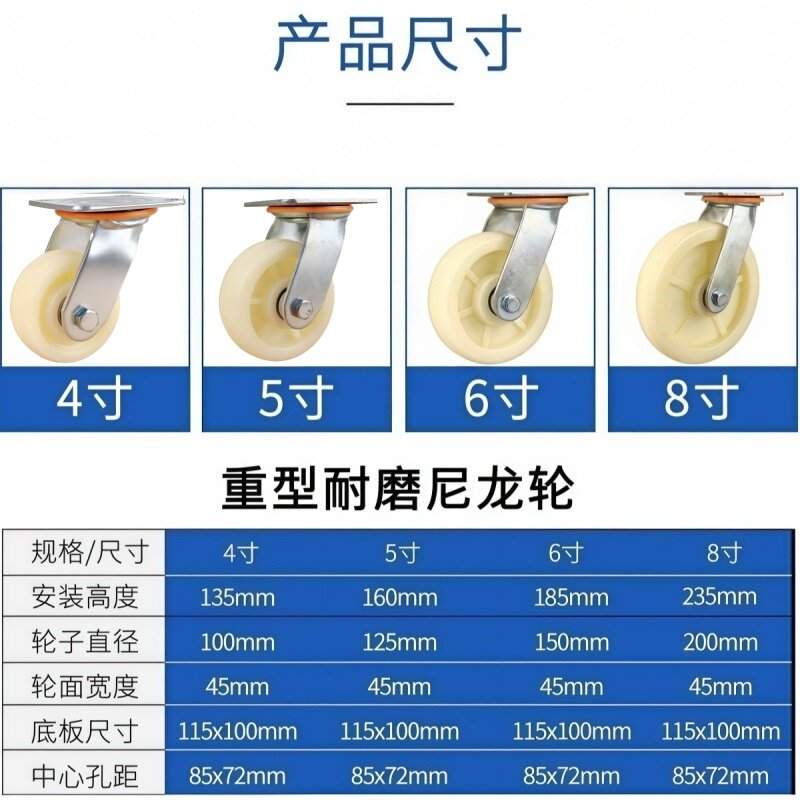 重型尼龙脚轮带刹1.5/2寸万向轮3/4/5寸耐磨手推平板车家具茶几轮