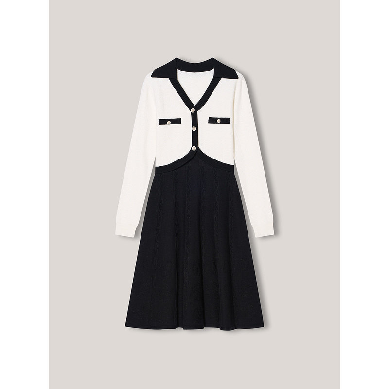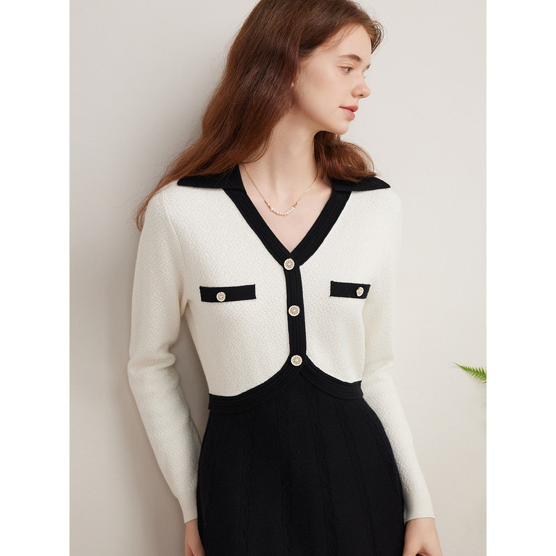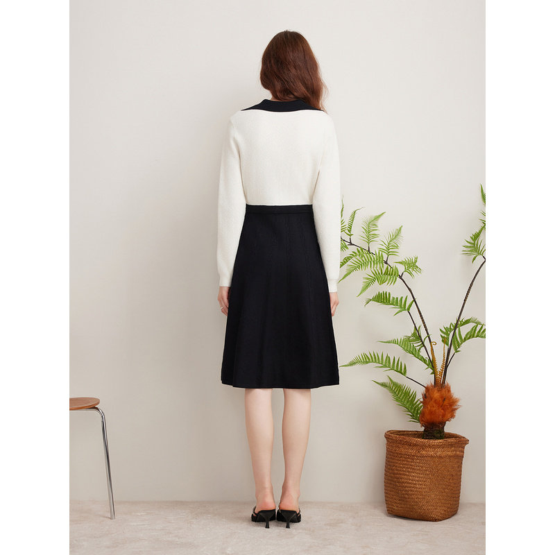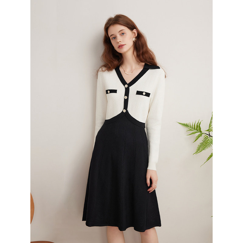 Goodland美地女装秋季时尚小香风黑白撞色海鸥领针织连衣裙