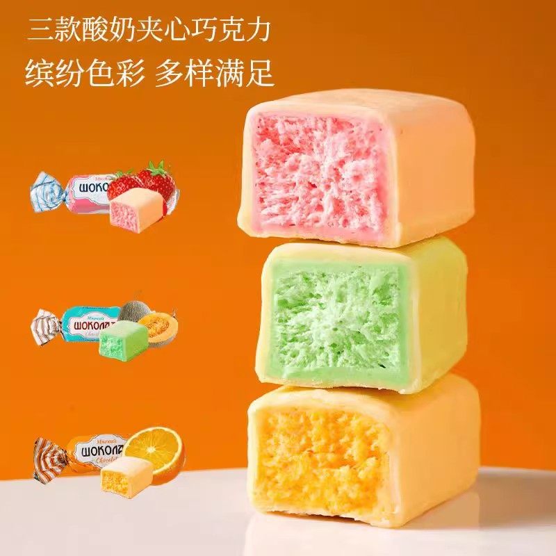 俄罗斯风味卢卡斯酸奶巧克力正品夹心果味零食年货圣诞喜糖果三色