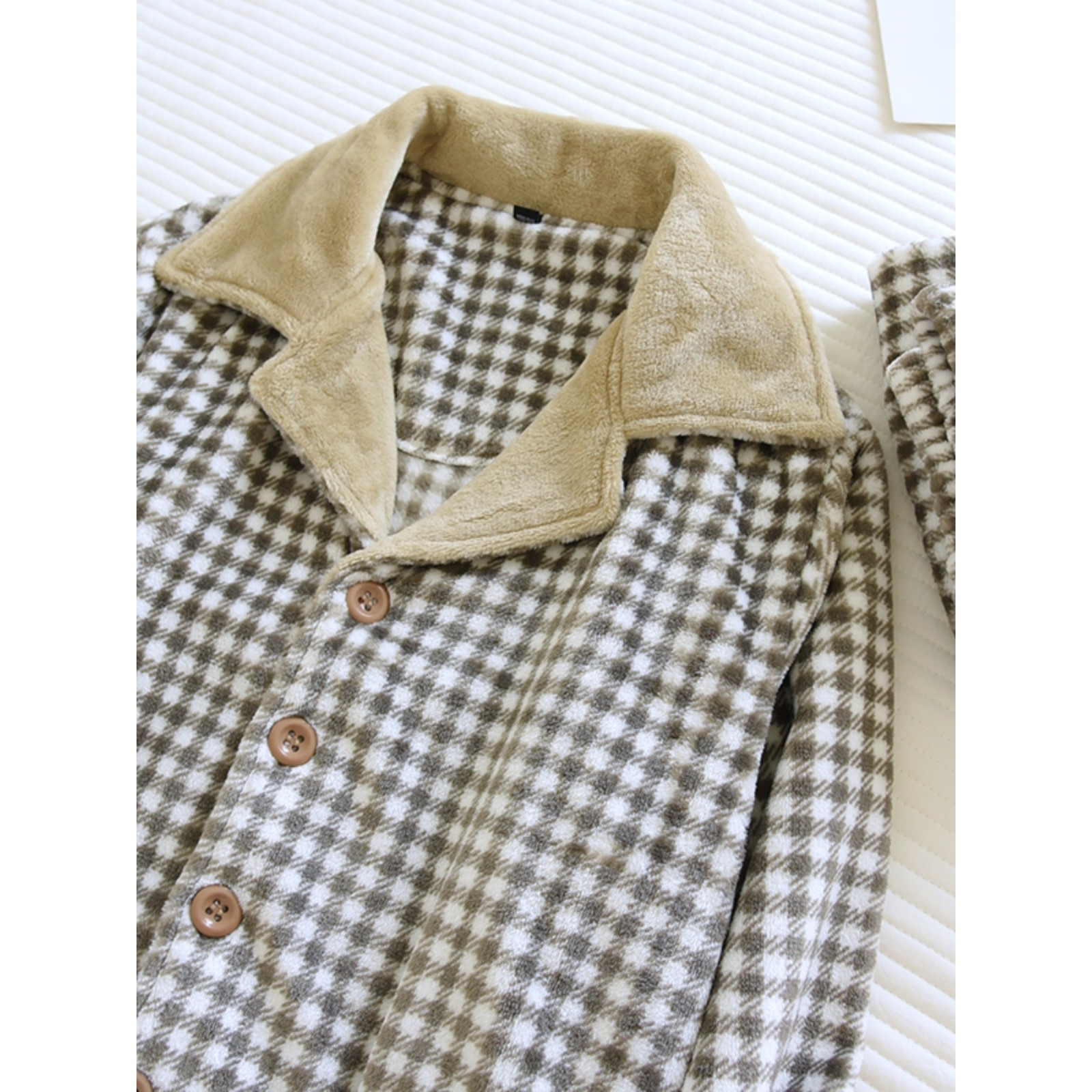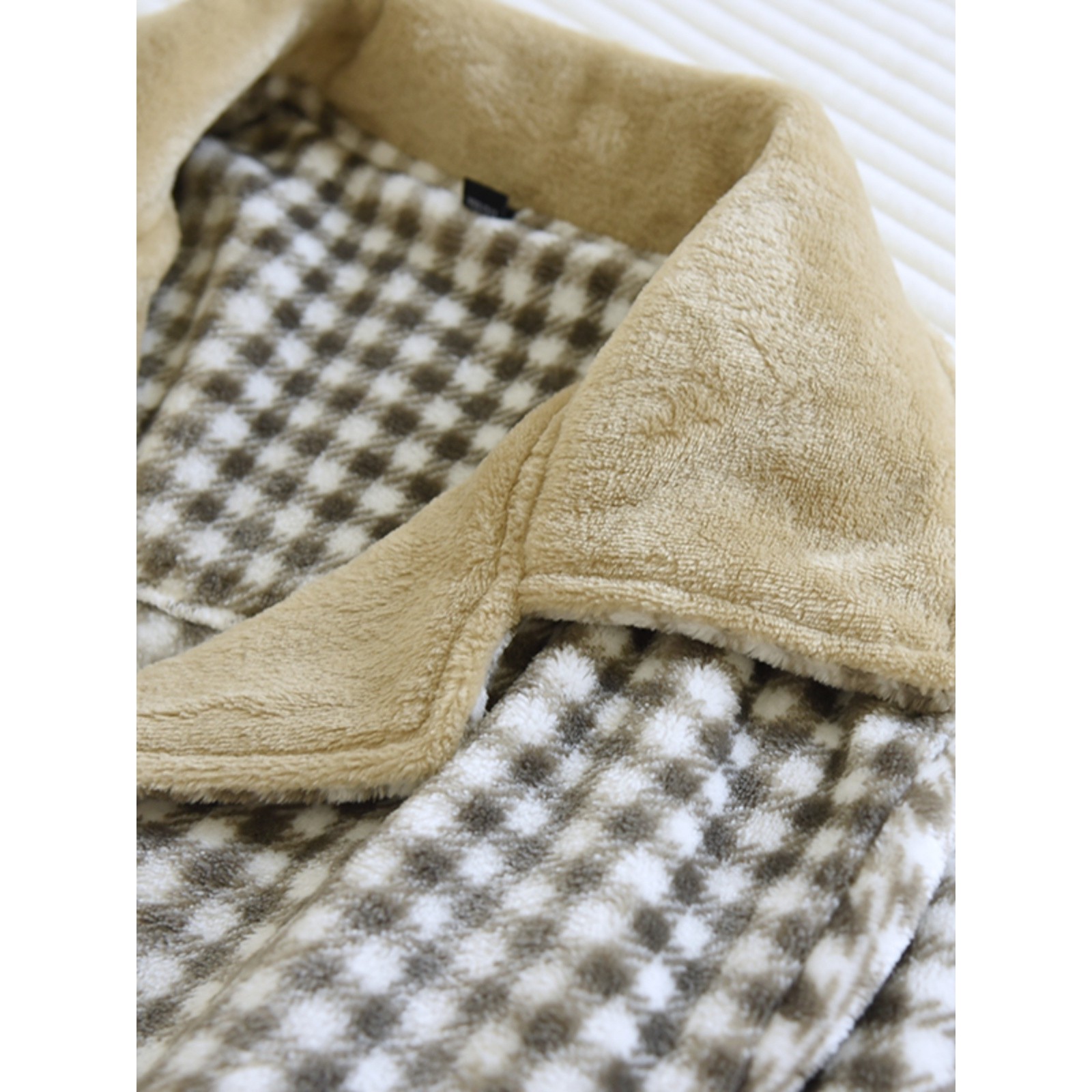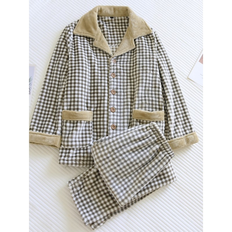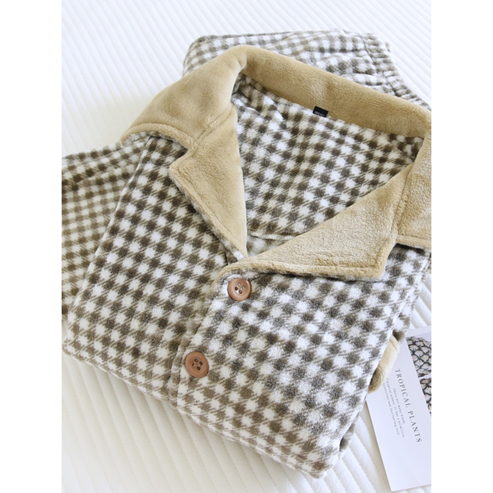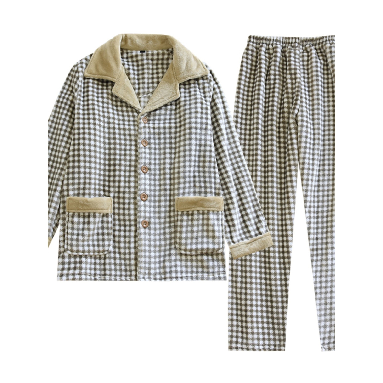 红豆外贸秋冬法兰绒睡衣男冬季加绒加厚珊瑚绒保暖日系格子家上衣
