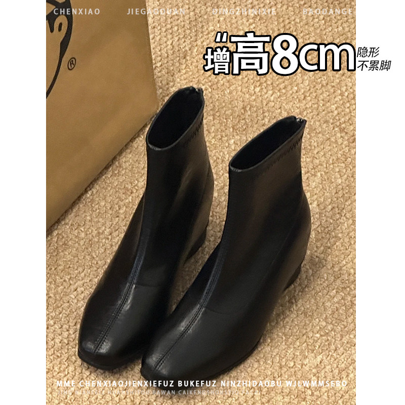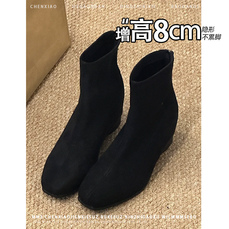 法式方头靴小个子内增高8CM瘦瘦靴女2025冬新款法式后拉链短靴子