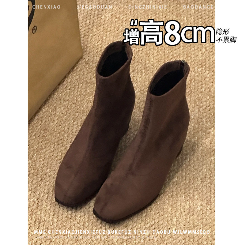 棕色靴子!小个子内增高7CM法式方头靴2025冬新款绒面粗跟短靴女