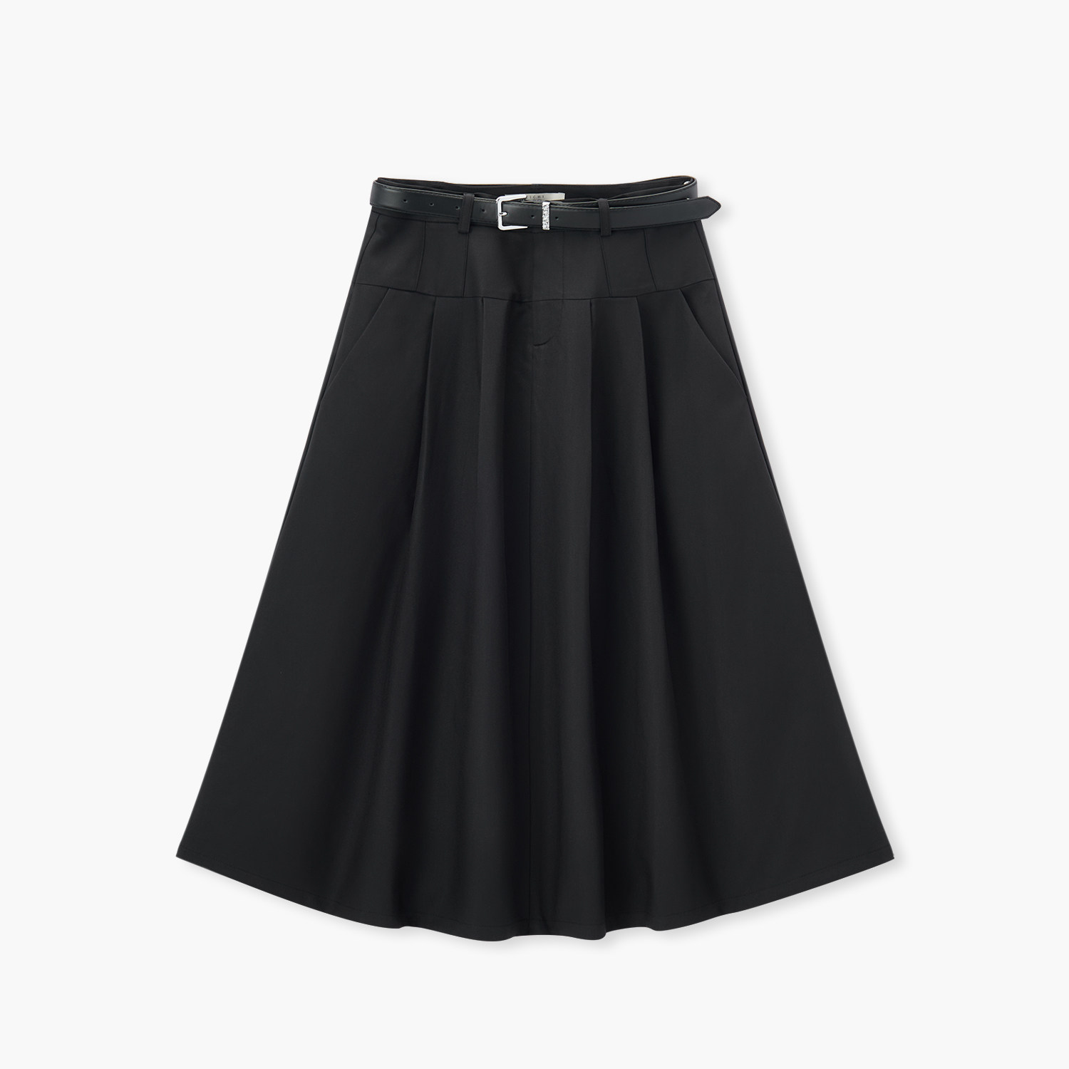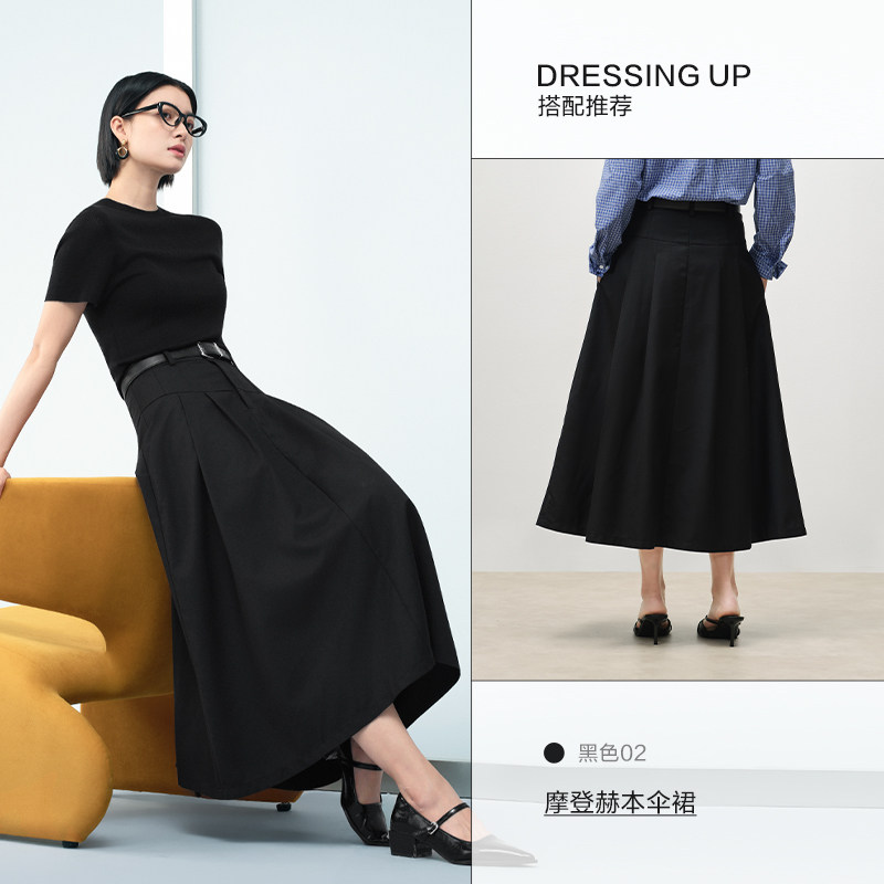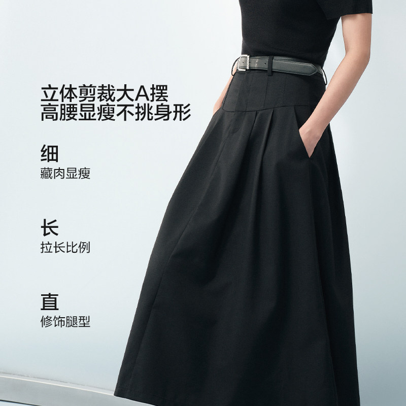 爱居兔黑色长款半身裙女2025年秋季新款A字腰带显瘦伞裙高腰单裙